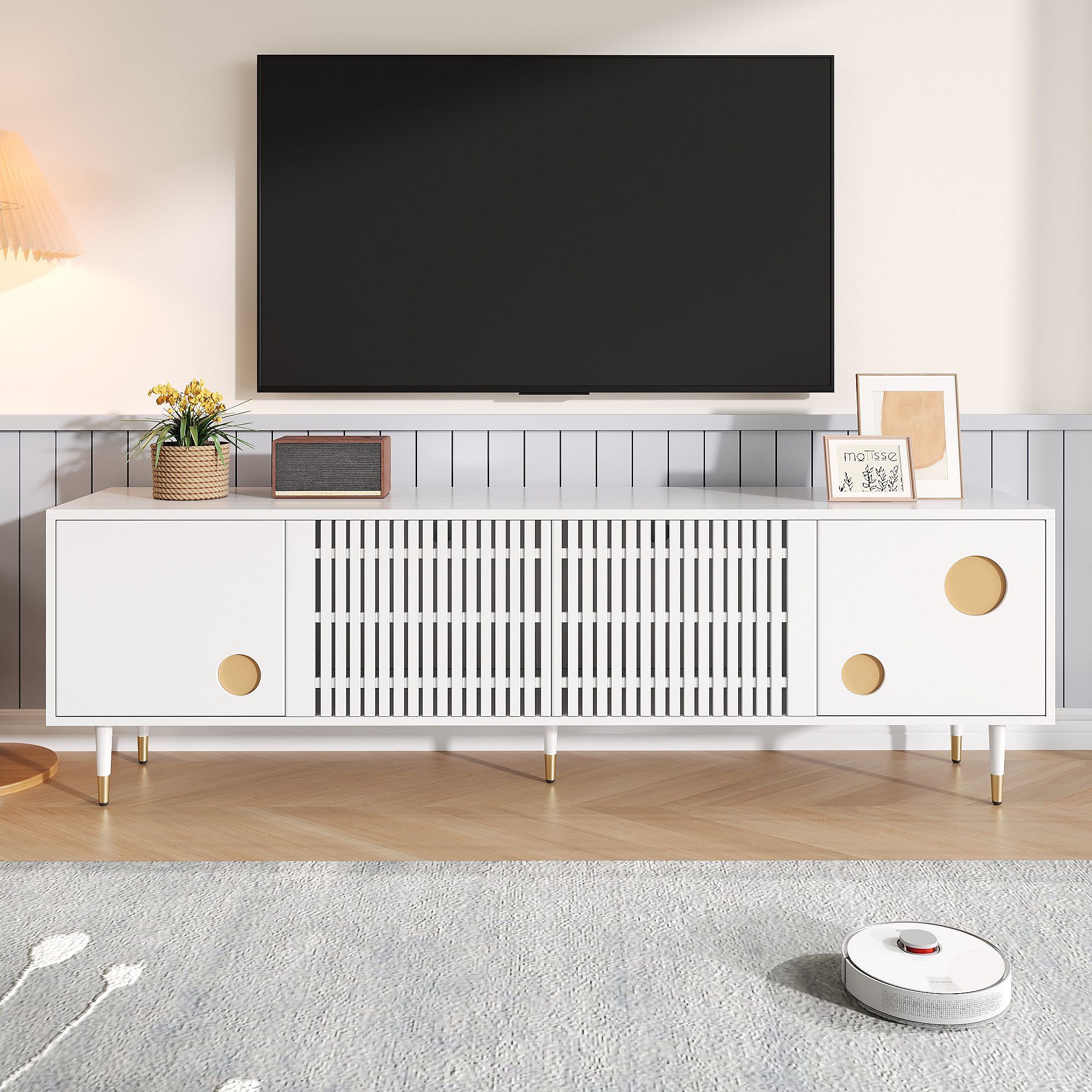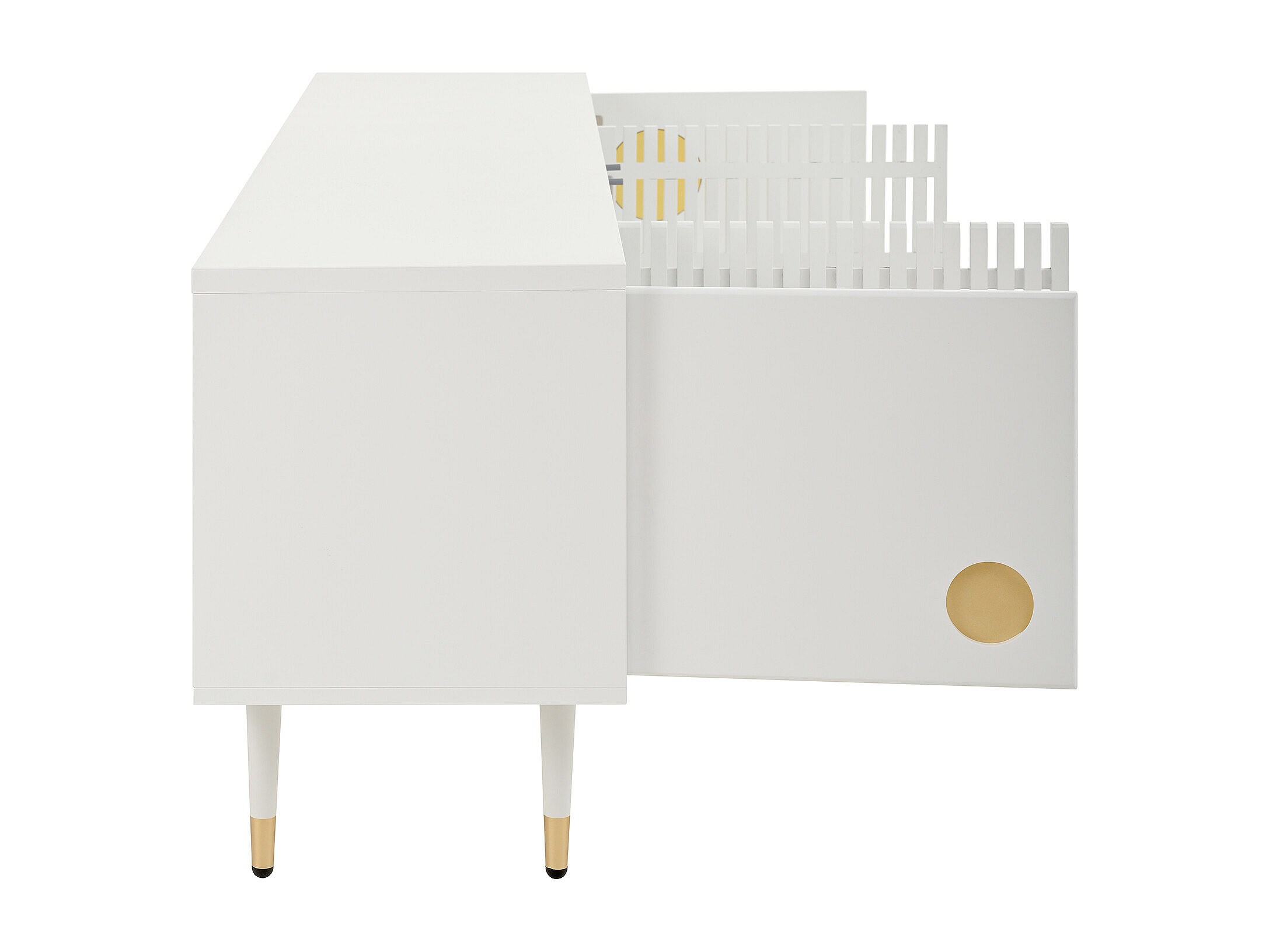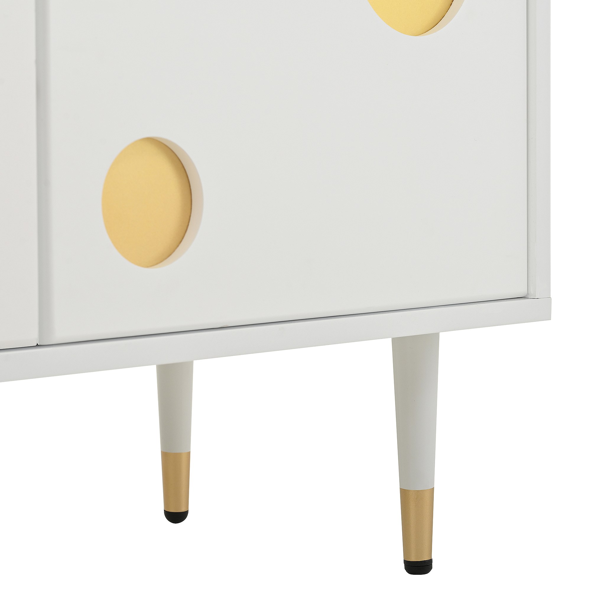 Mobile TV bianco con 2 ante e 4 cassetti, maniglie e piedini dorati - adatto a soggiorni e uffici