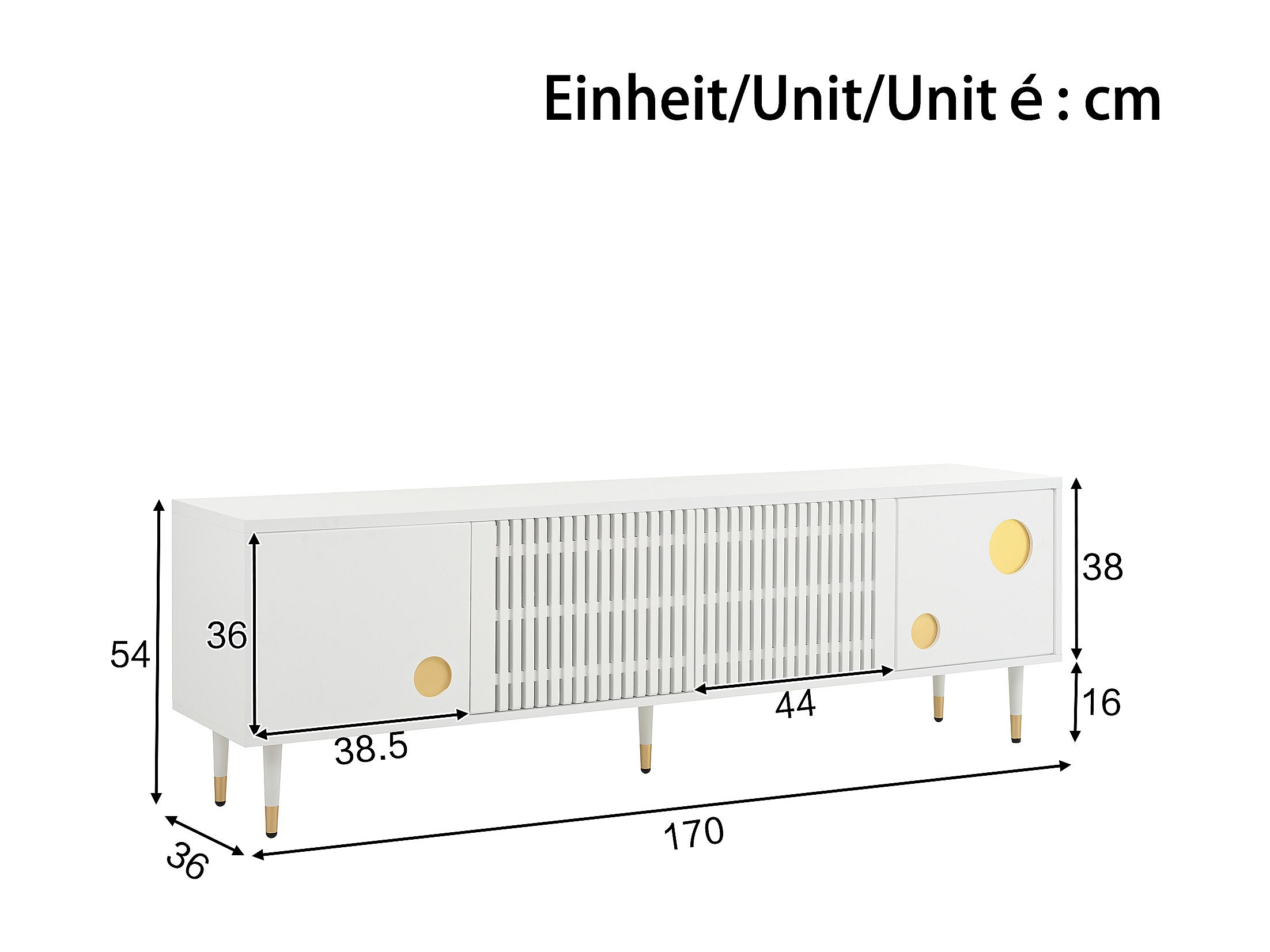 Mobile TV bianco con 3 ante e 2 cassetti, maniglie e gambe dorate - per soggiorno