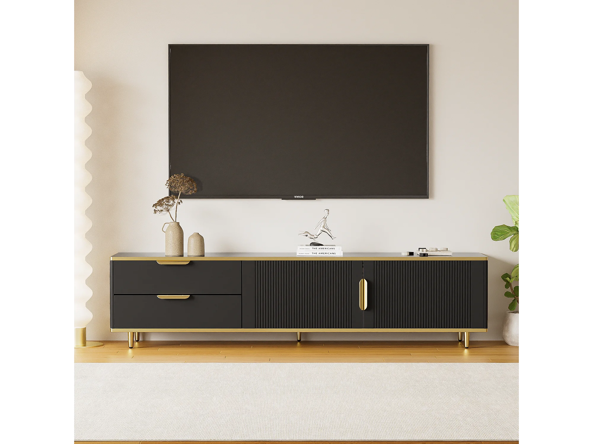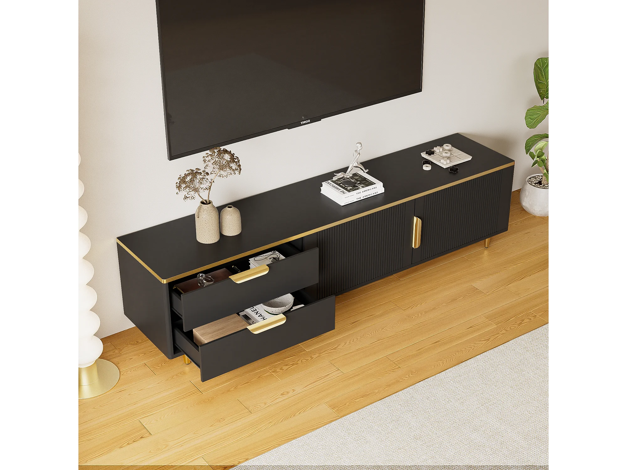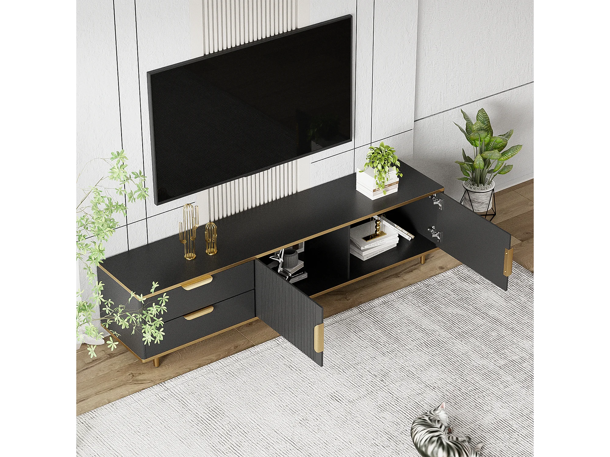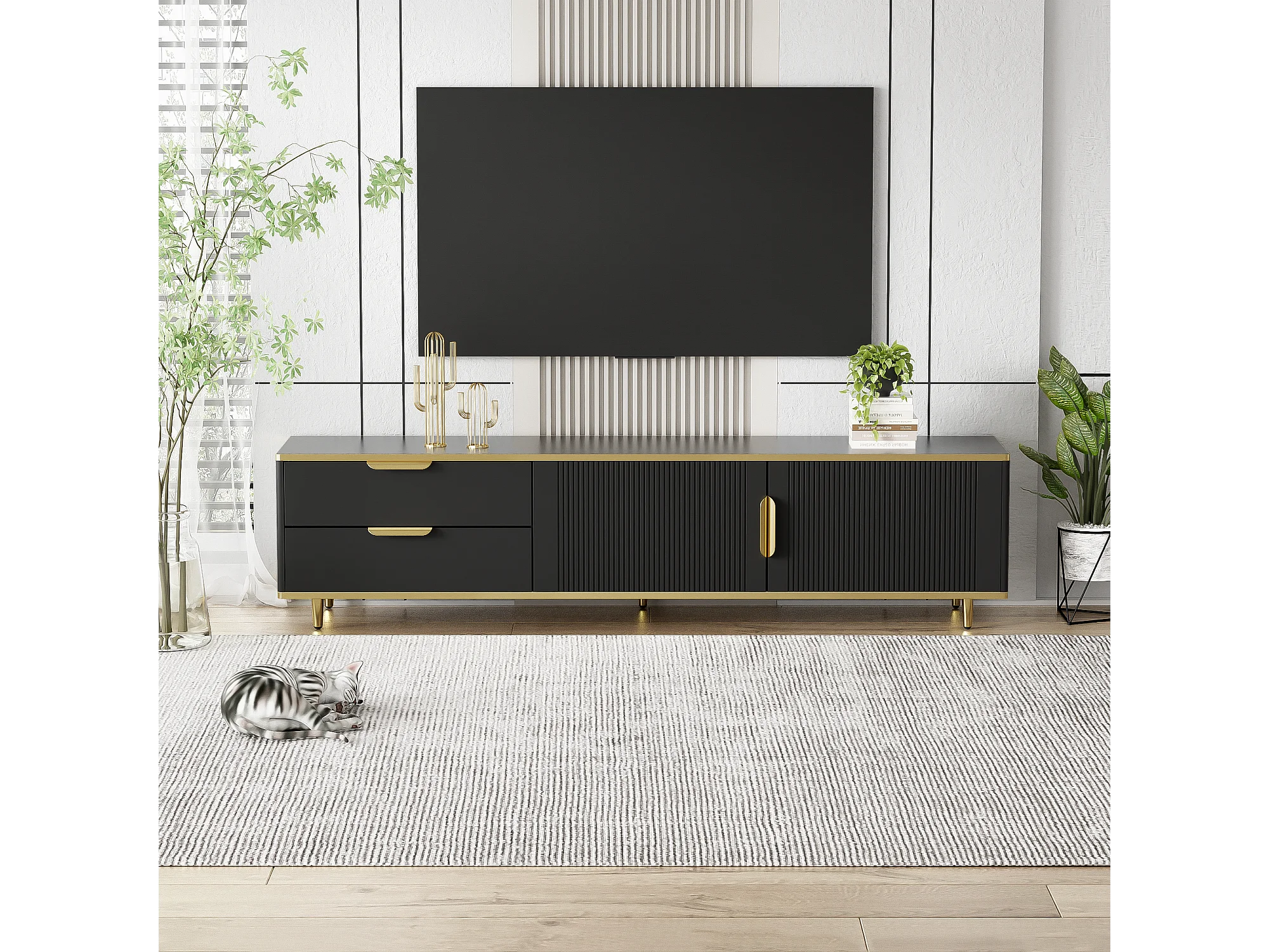 Mobile TV con 2 ante e 2 cassetti - 175x40x45 cm - Legno MDF - maniglie e piedi dorati - piano con motivo marmorizzato - nero
