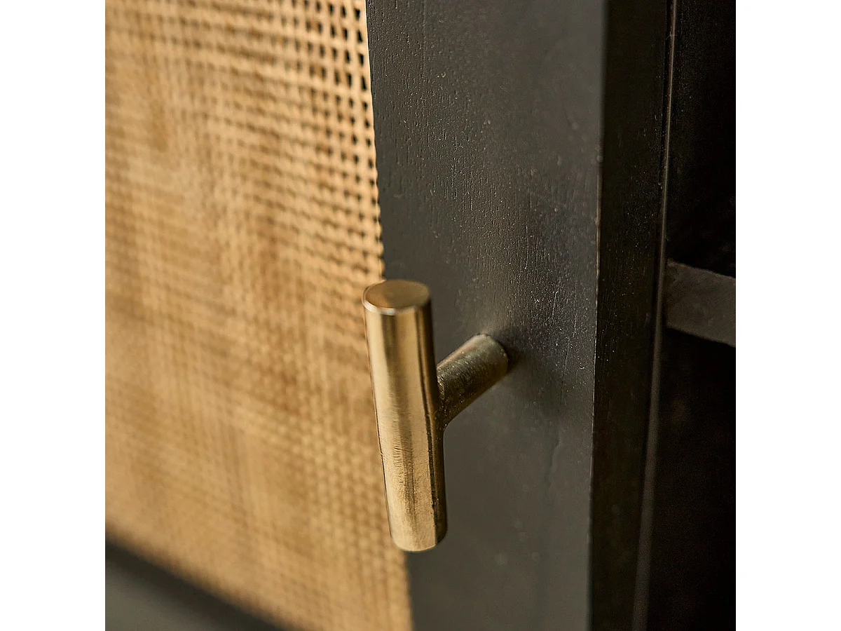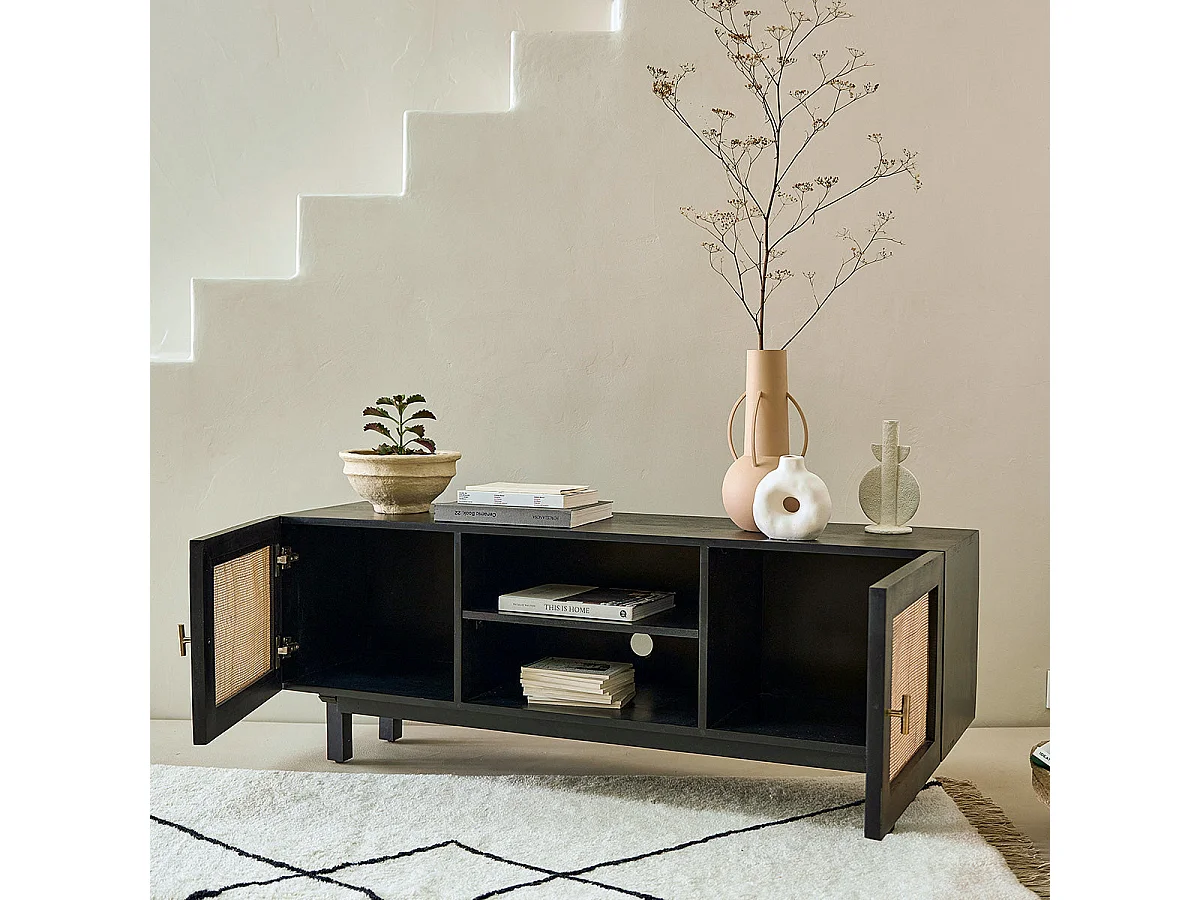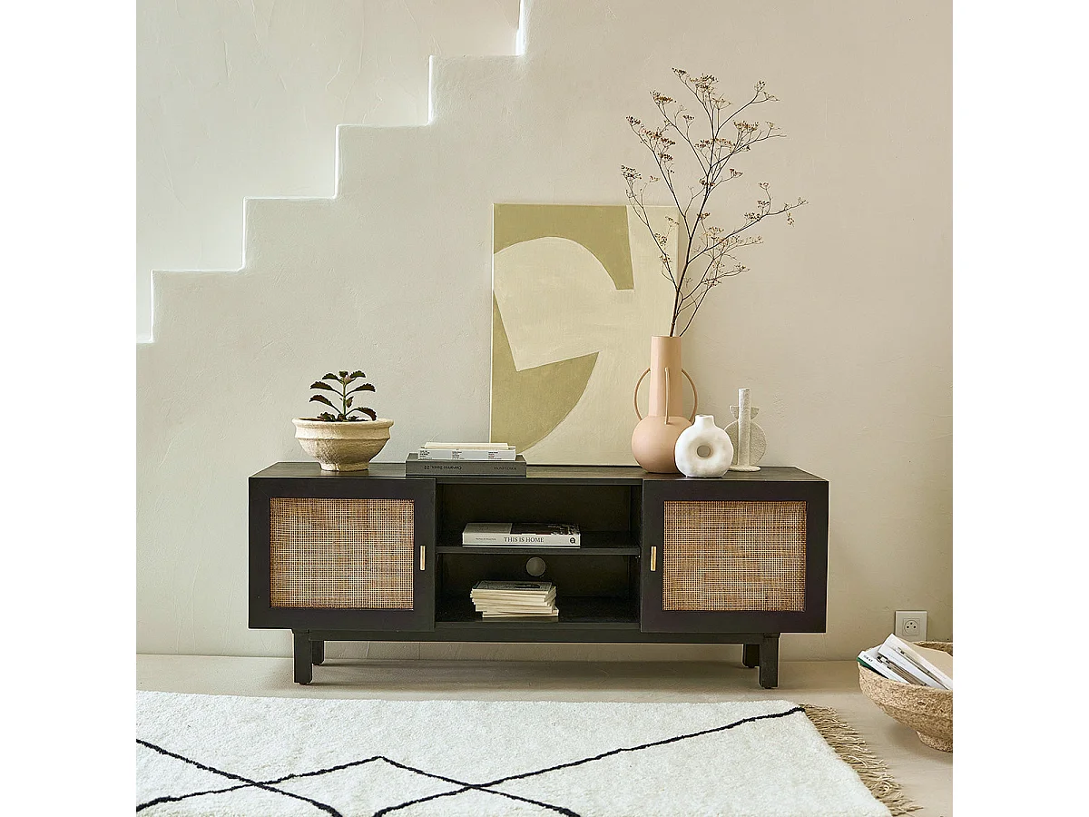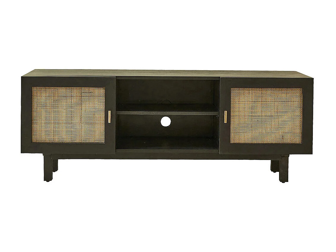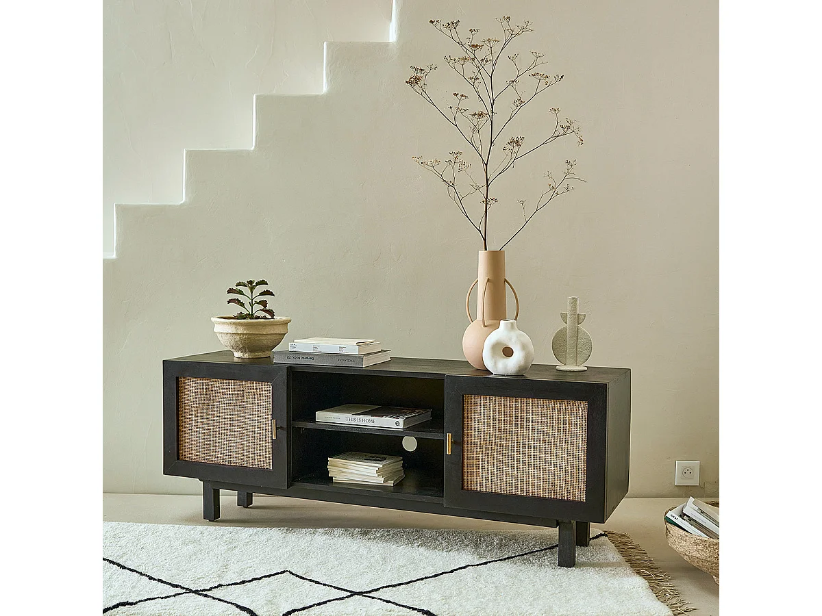Mobile TV in mango massello nero e vimini 120 cm