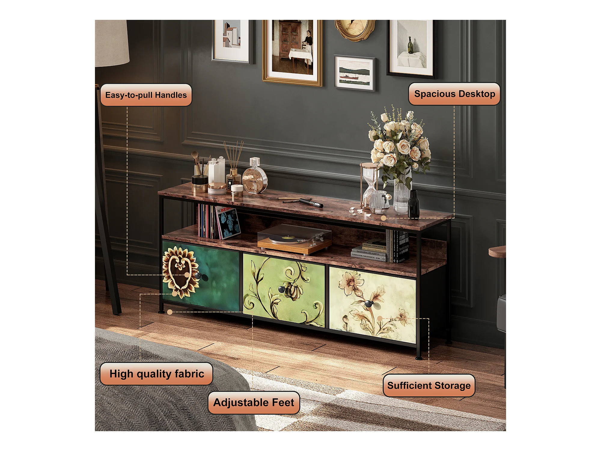 Mobile TV LED da 137 cm, piano effetto legno tigrato, 3 cassetti in tessuto vintage, robusta struttura in metallo, gambe regolabili, stile retrò-moderno