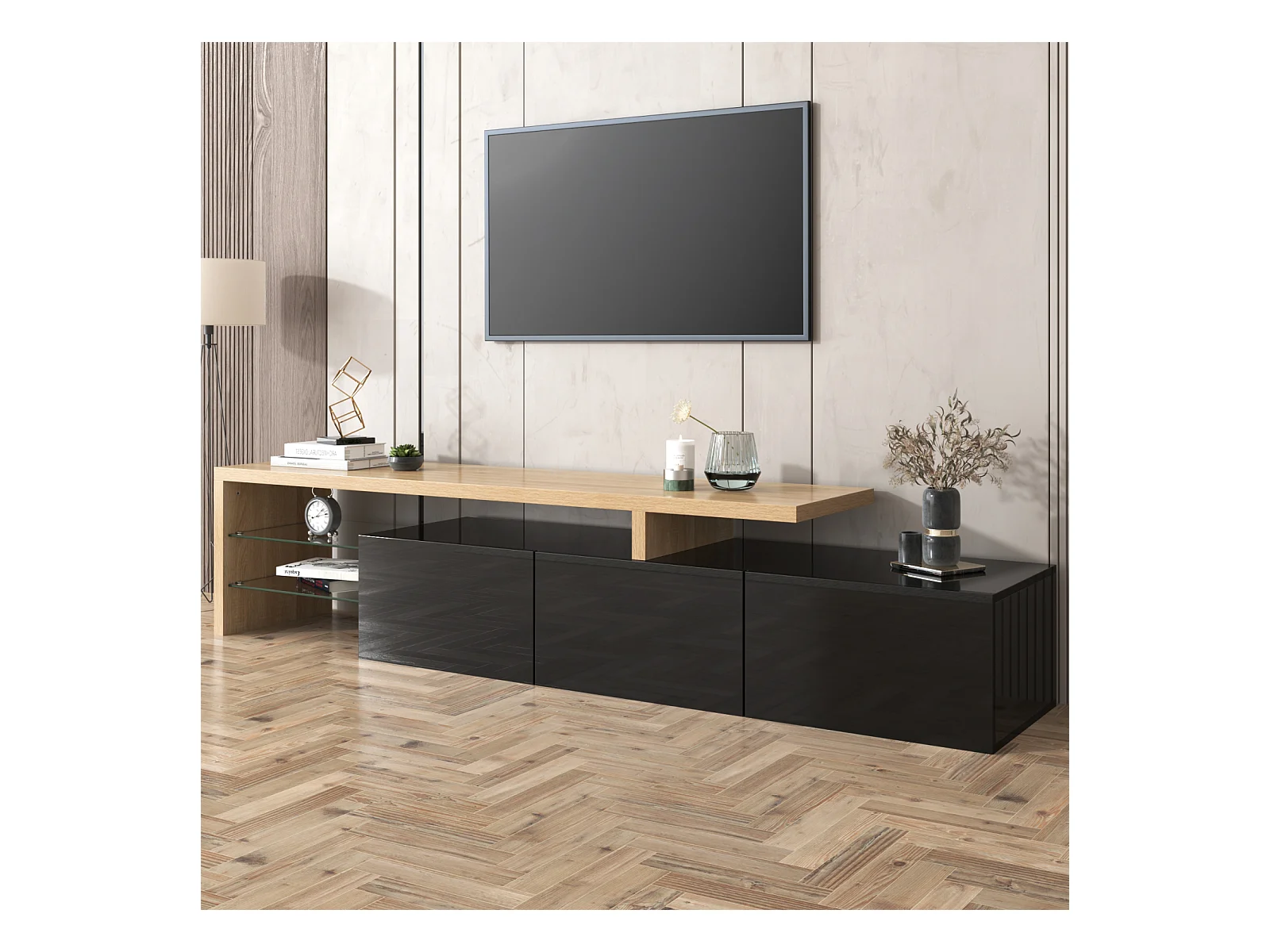 Mobile TV lucido 197,5 L x 39 P x 42 A (cm), stile moderno, pratico spazio di archiviazione, effetto legno, ripiani in vetro, illuminazione a LED, nero