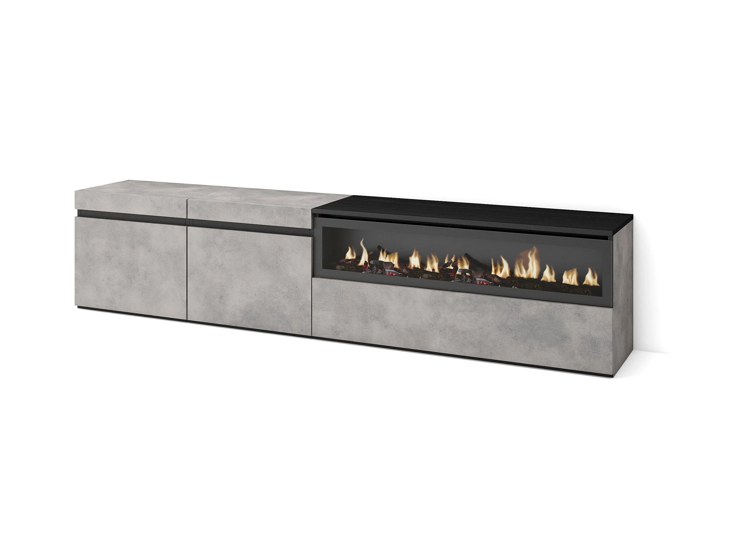 Mobile TV Soggiorno, 200x35x45cm, Per TV fino a 80", Camino elettrico, Cemento