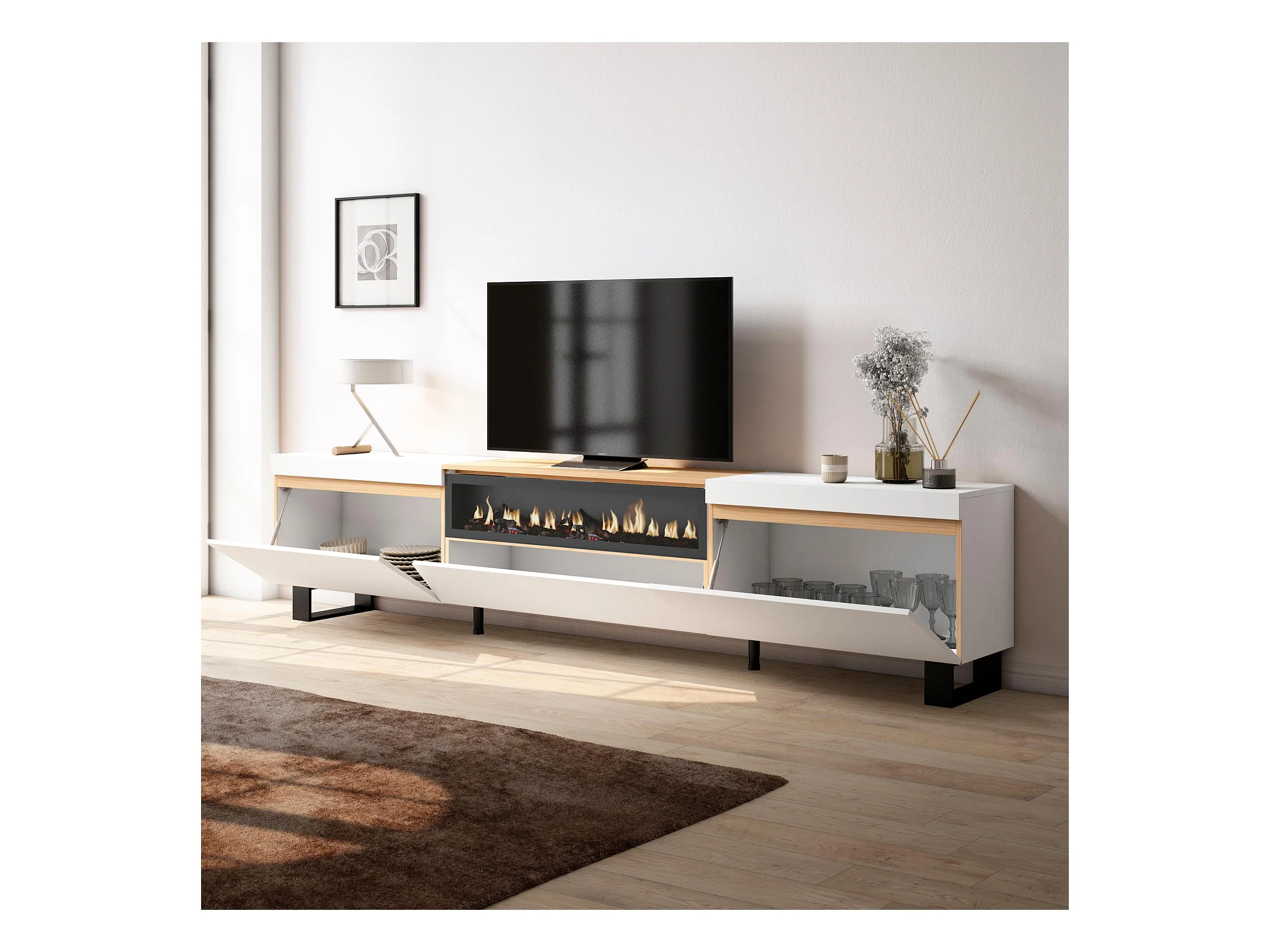 Mobile TV Soggiorno, 288x35x57cm, TV di grande formato, Camino elettrico, Design industriale, Bianco e Rovere soft