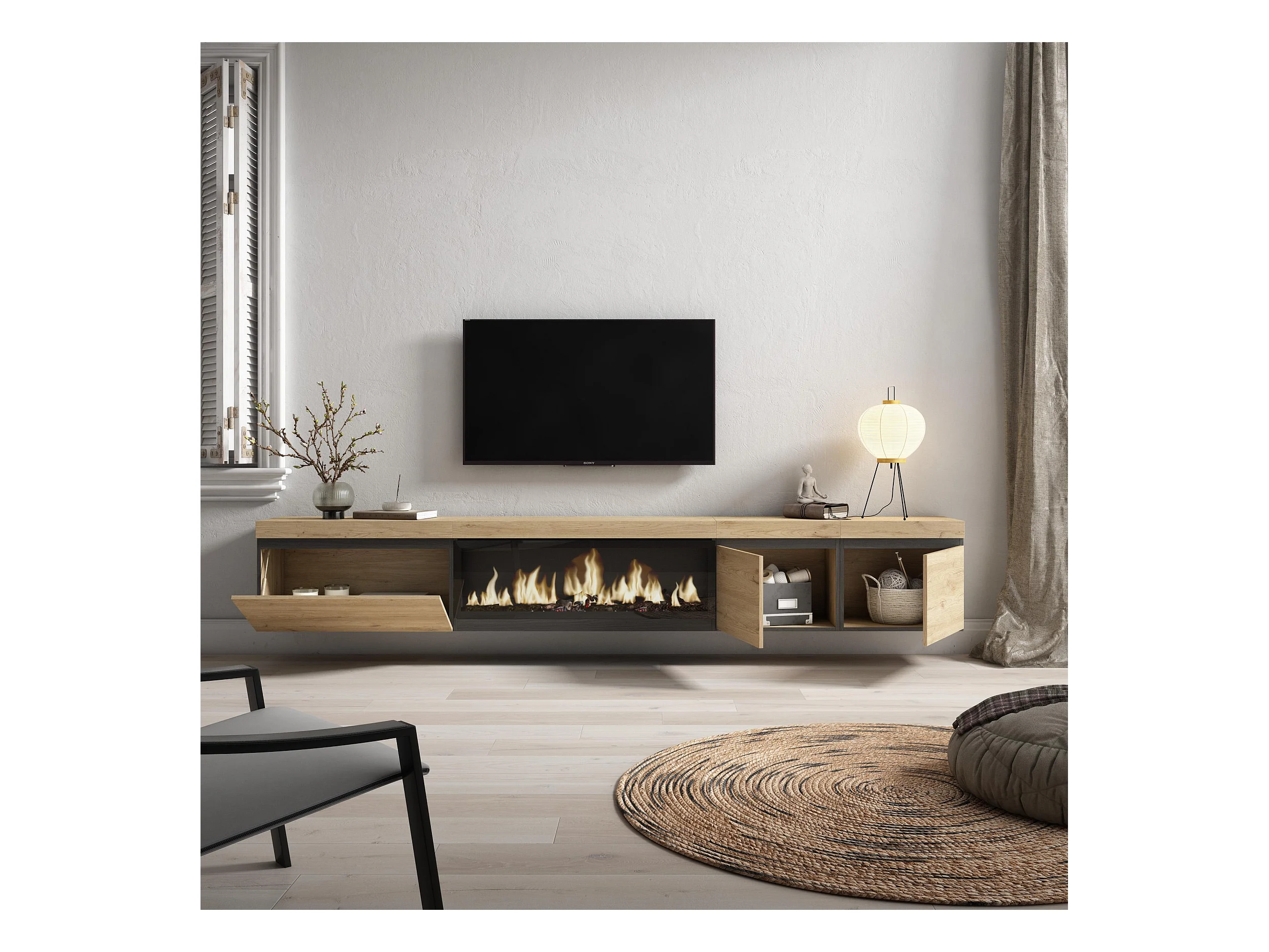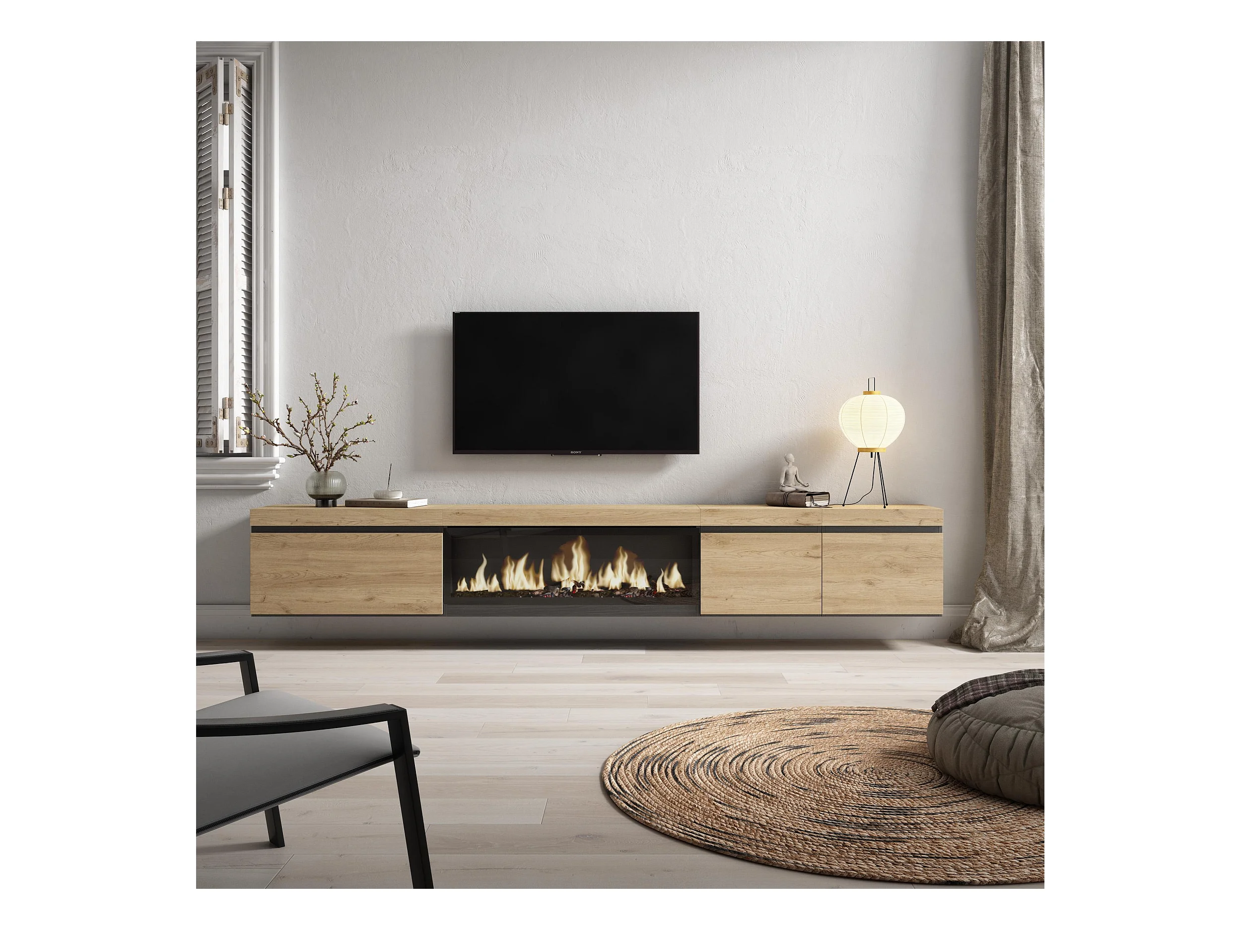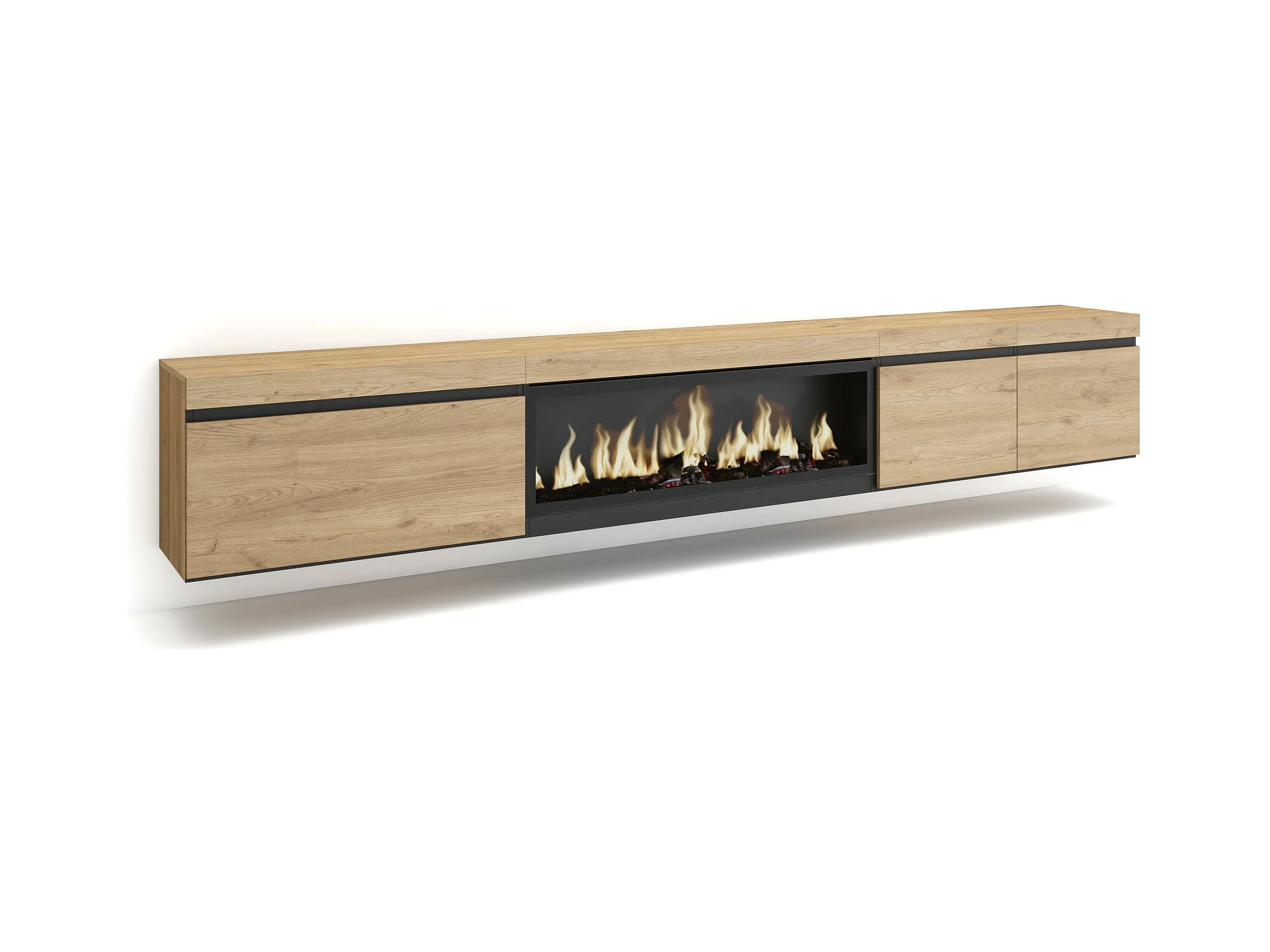 Mobile TV Soggiorno, 288x35x45cm, TV di grande formato, Camino elettrico XXL, Sospeso, da appendere, Rovere