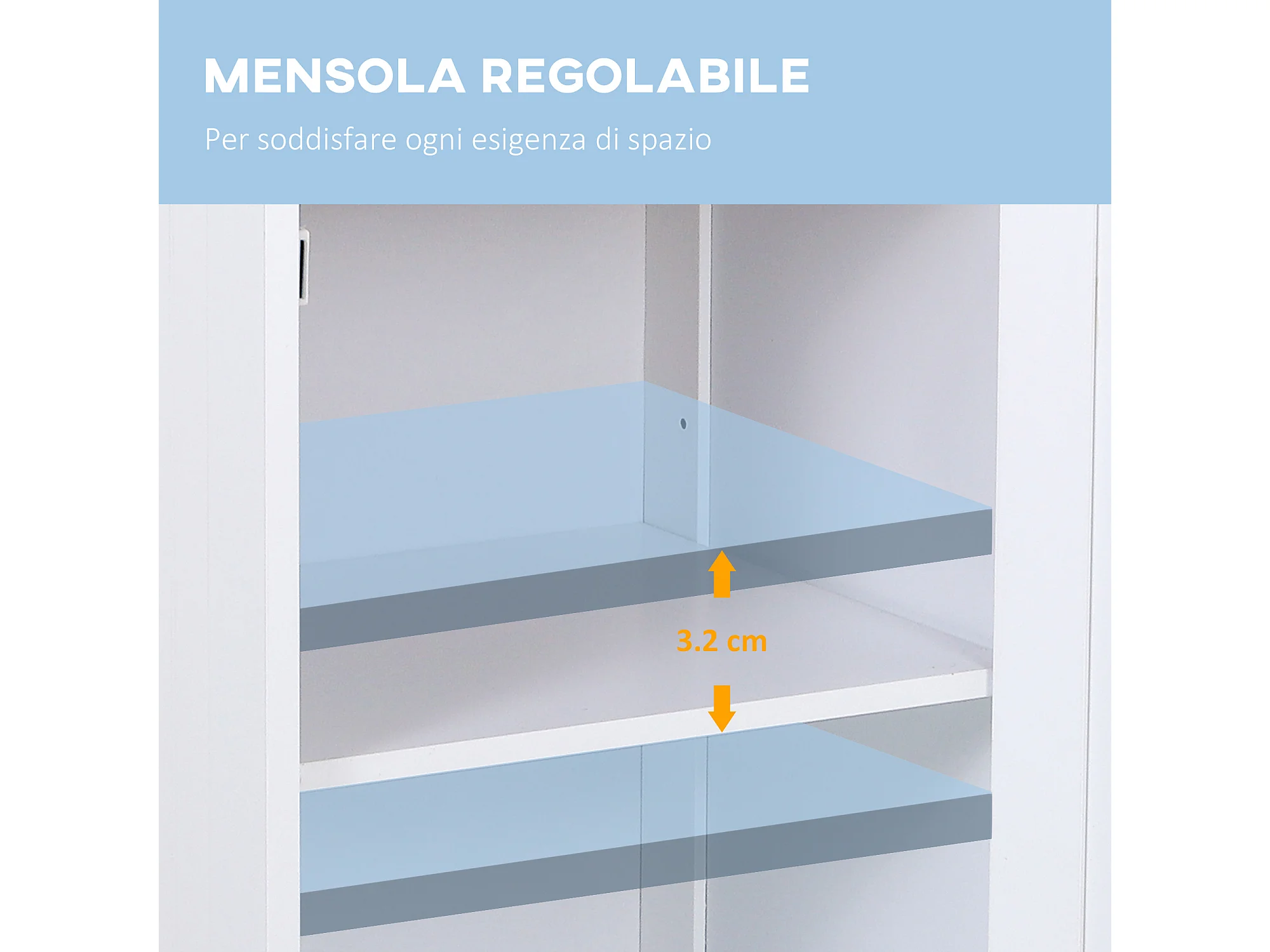 Mobile bagno con 3 ripiani aperti, ante in vetro temperato, ripiani regolabili, MDF laccato bianco (49,5x35x170 cm)