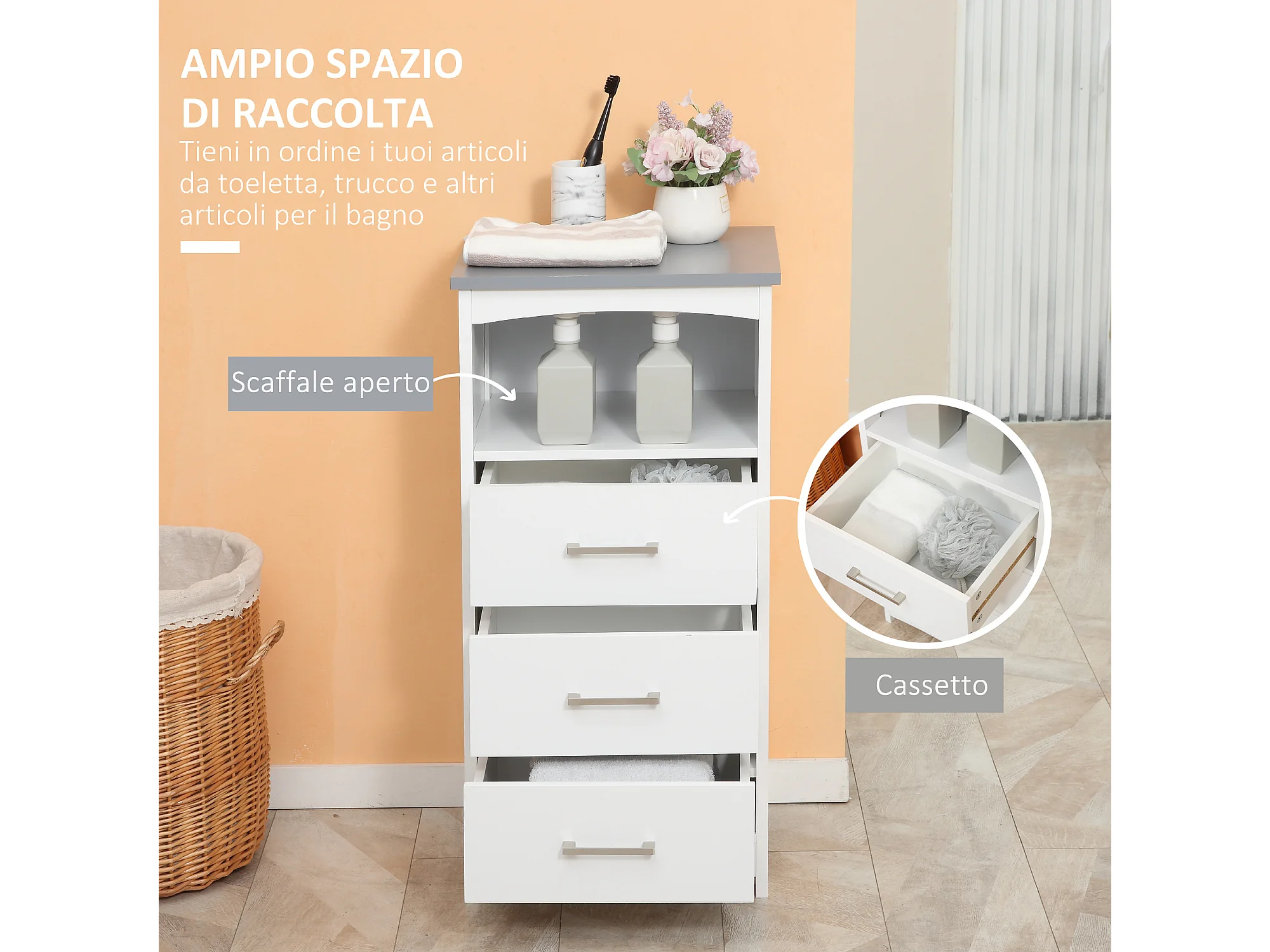 Mobile da bagno con cassetti e ripiano regolabile in mdf bianco