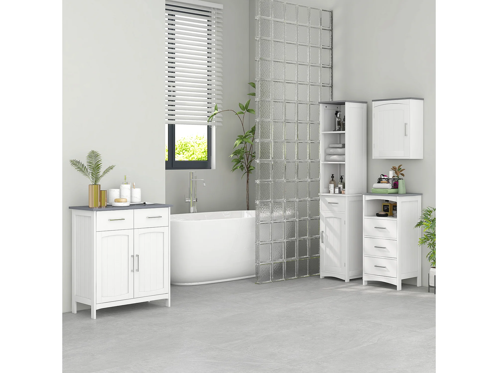 Mobile bagno multiuso con 2 armadietti e ante in vetro e legno bianco
