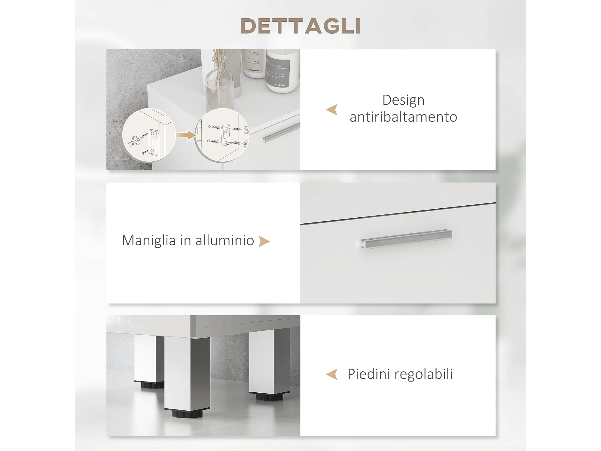 Mobiletto bagno salvaspazio con ruote a freno mobile bagno con 3 cassetti