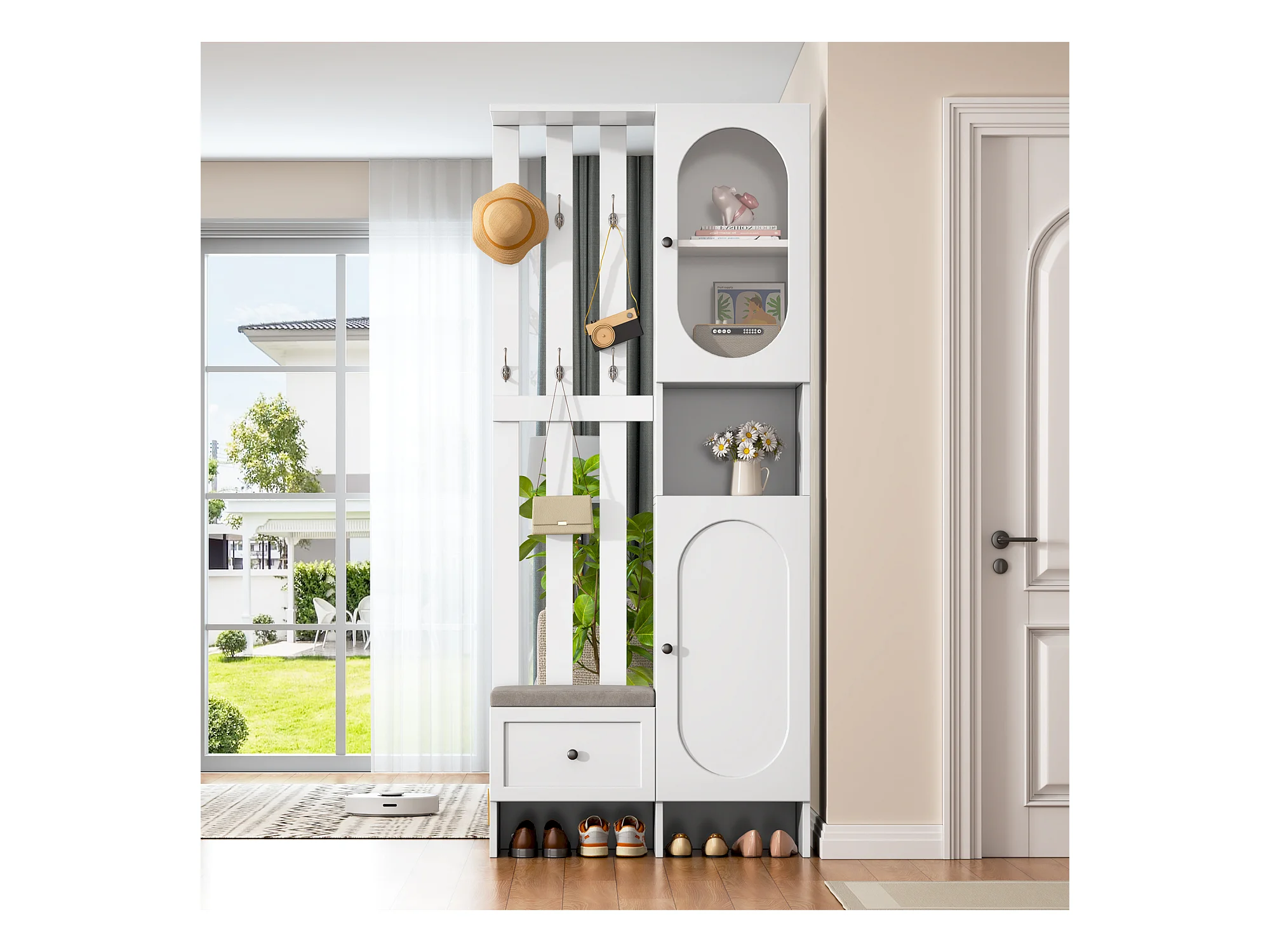 Set guardaroba con panca contenitore, attaccapanni, 4 ganci, MDF bianco (H180 x L100 x P35 cm)