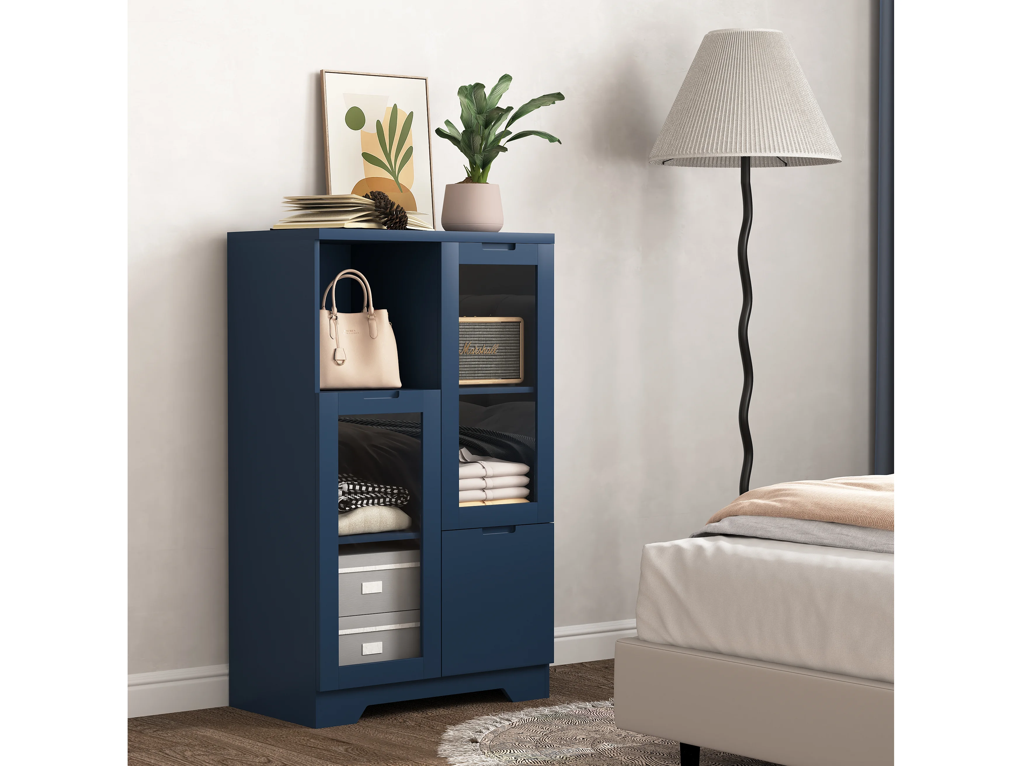 Mobiletto in MDF con ante in vetro e cassetto, vano portaoggetti aperto, bianco (65x30x100 cm)
