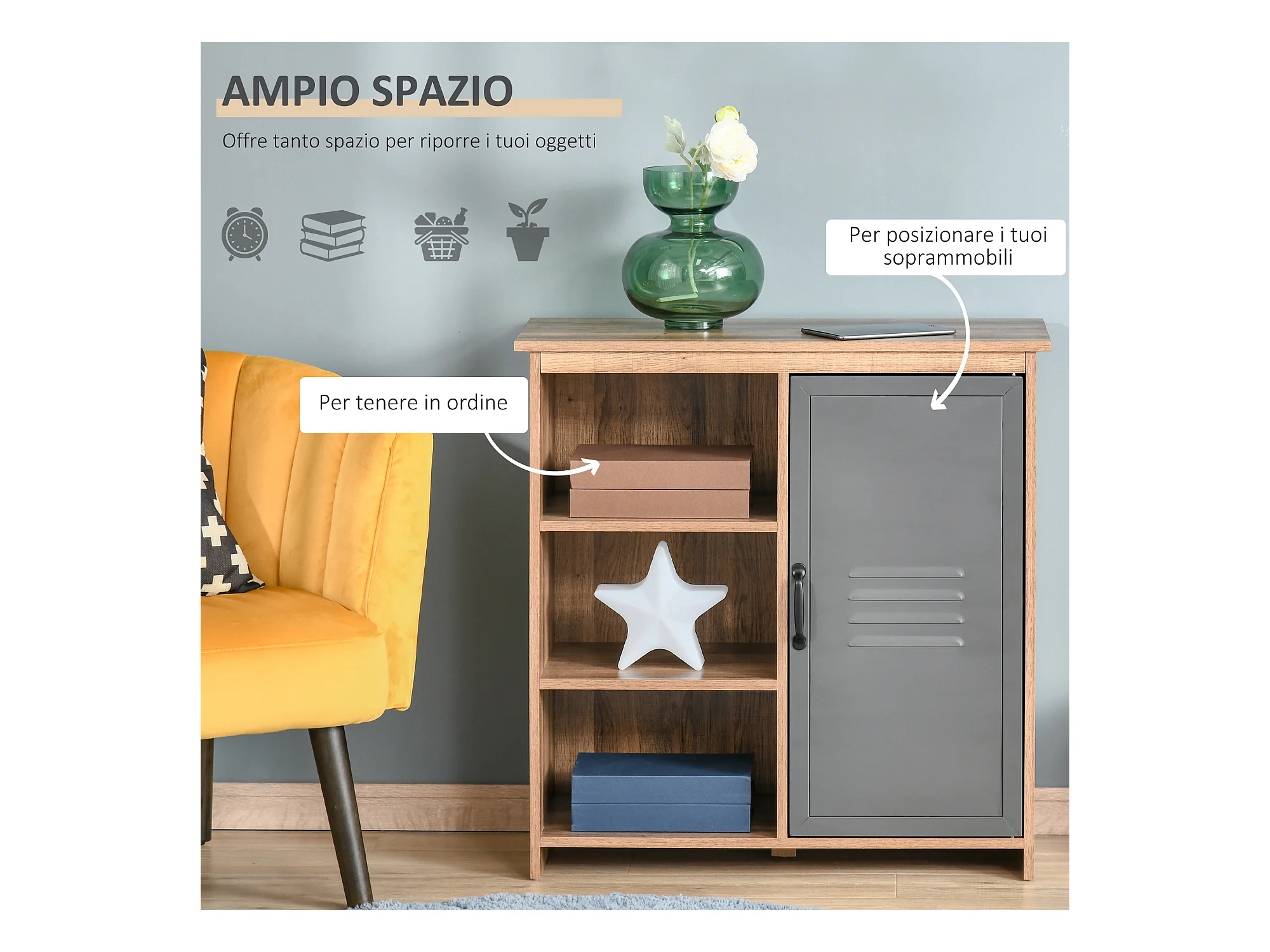 Mobiletto multiuso ripiani aperti e armadietto in legno metallo