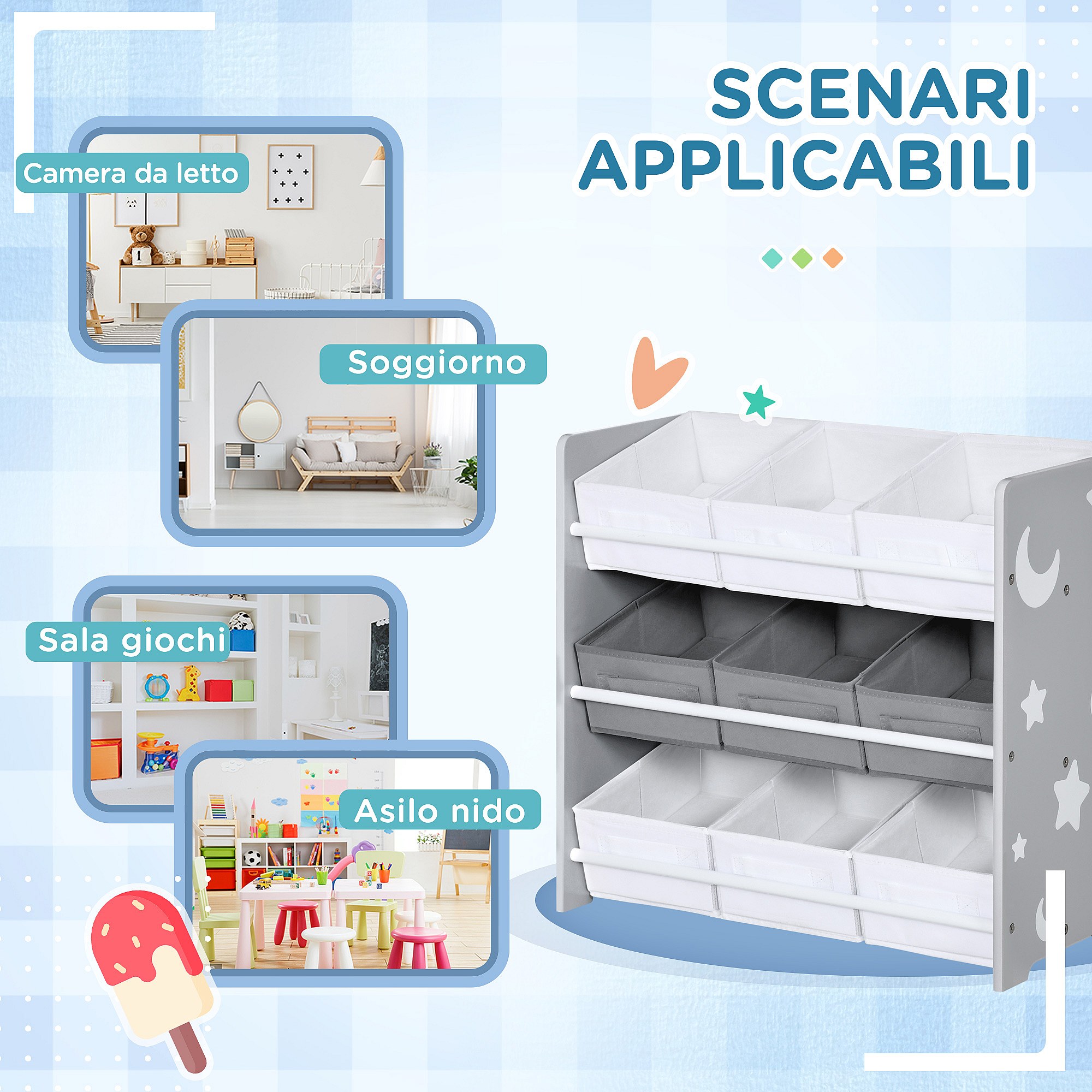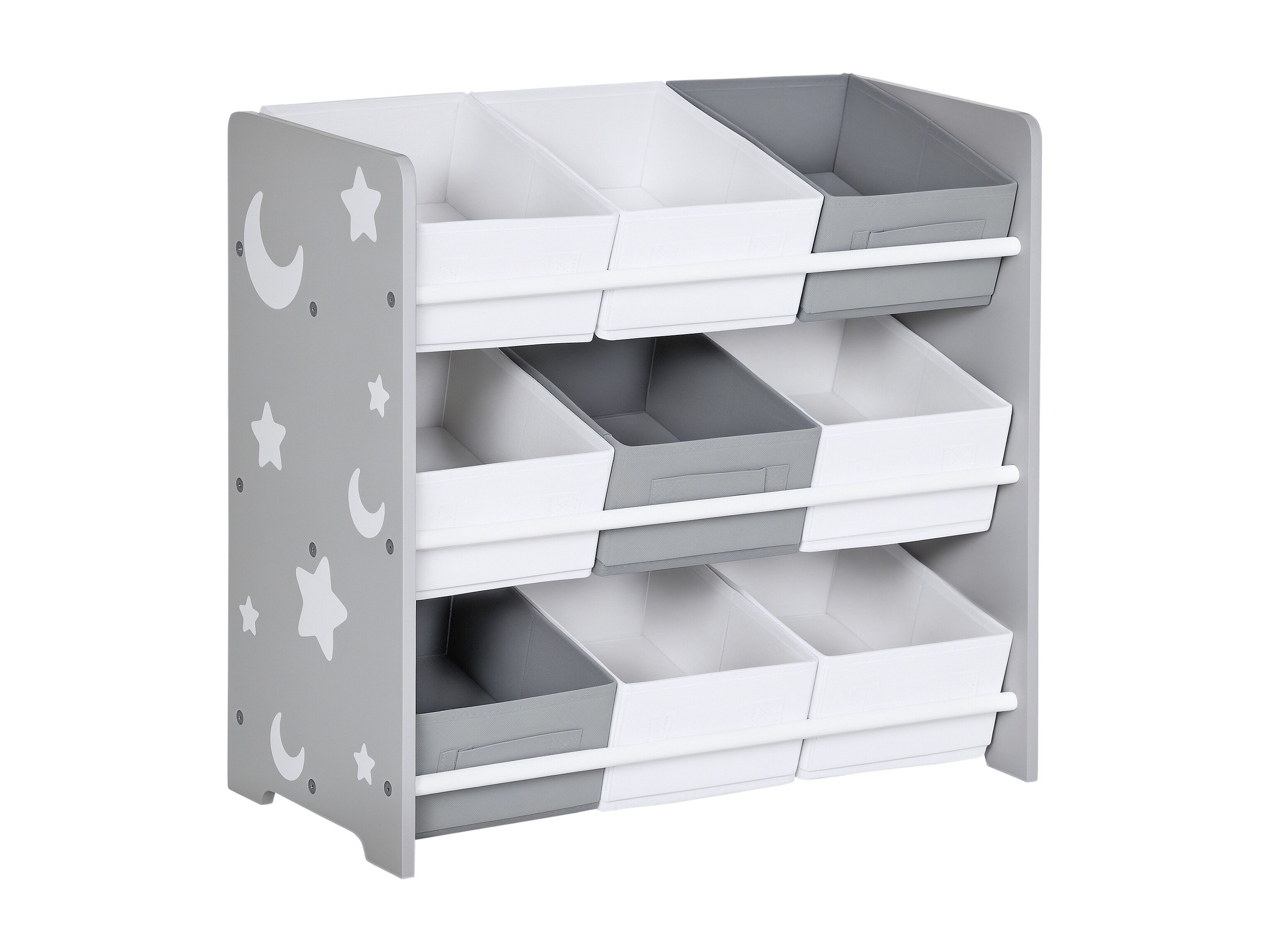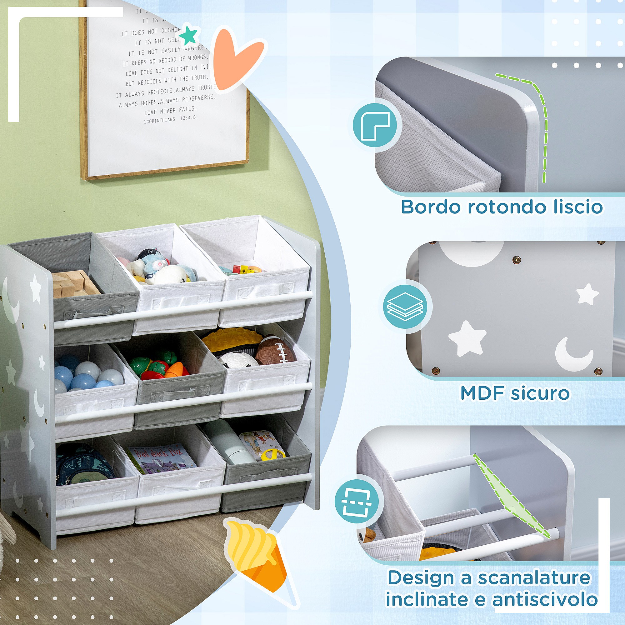 Mobiletto portagiochi con 9 cestini in legno mdf e tessuto