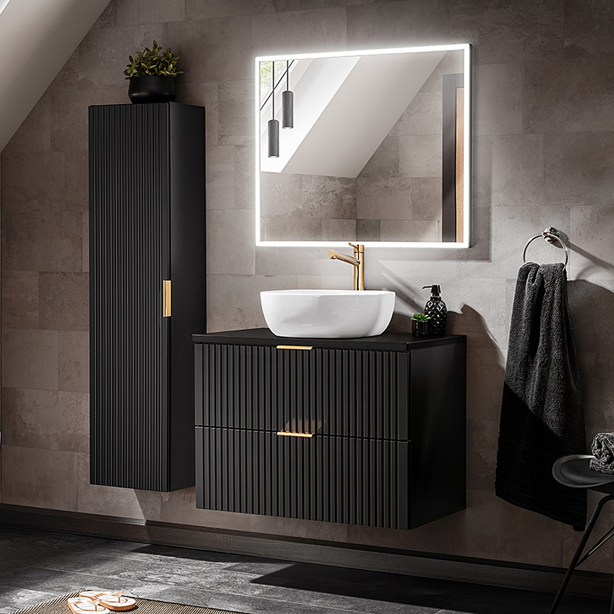 Mobiletto singolo da 80 cm con specchio LED e piedistallo Adriel in nero