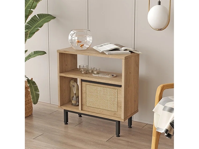 Mobiletto soggiorno 60x26x60cm legno 2 scaffali anta effetto rattan Opoli