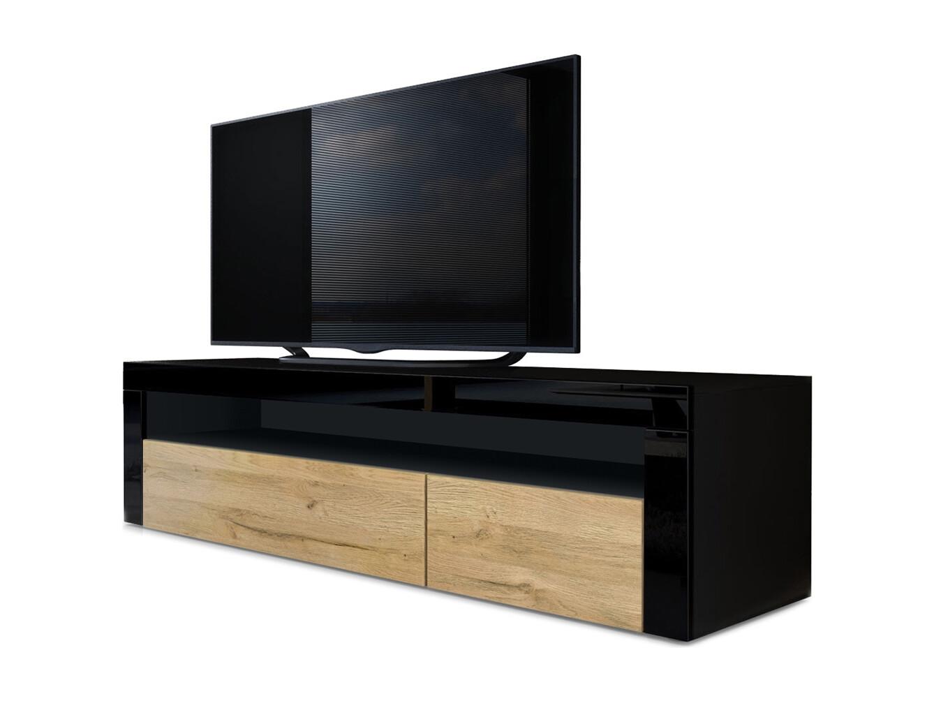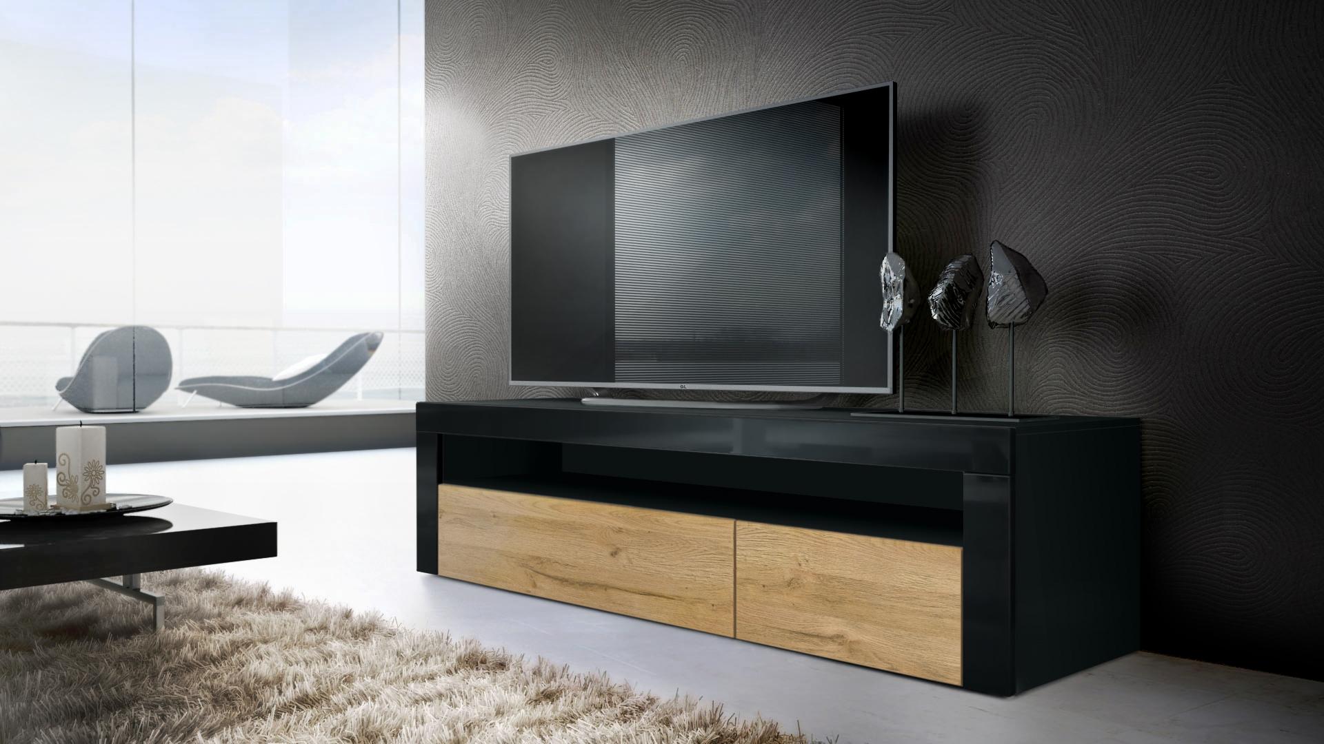 Mobiletto Valencia, mobile TV con 1 vano a giorno e 2 ante a ribalta, nero opaco/rovere naturale/nero lucido (155 x 46 x 40 cm)