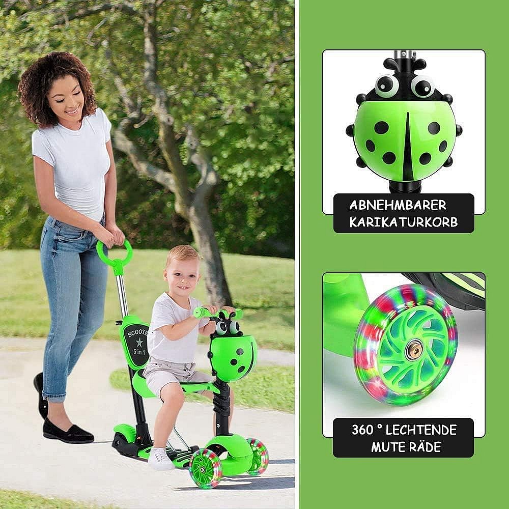Monopattino Bambini 5-in-1 con Cestino Cartone Animato Rimovibile, Seggiolino, Barra Spingi, Ruote LED, Schienale Comodo, Altezza Regolabile dai 2 Anni, verde