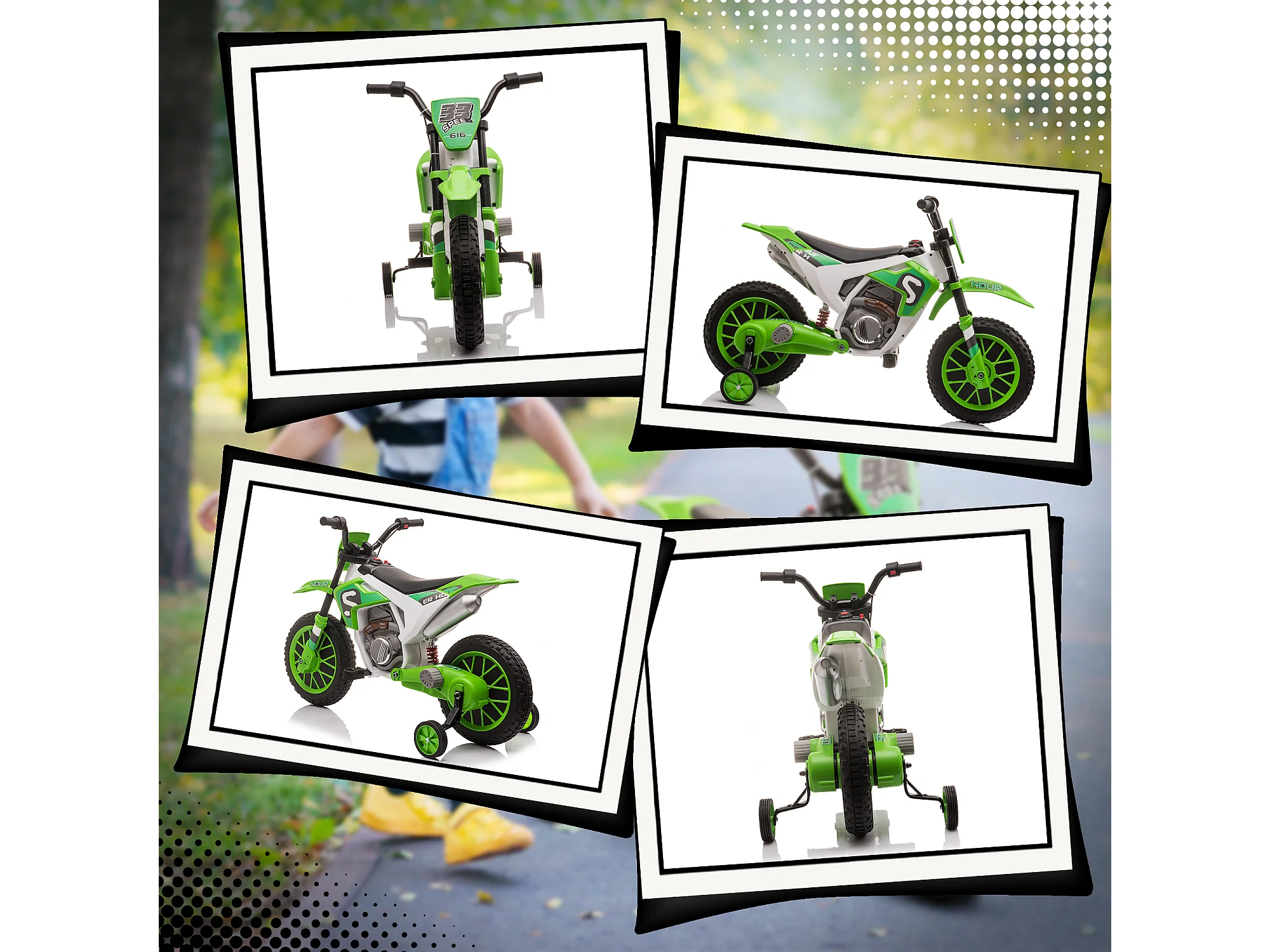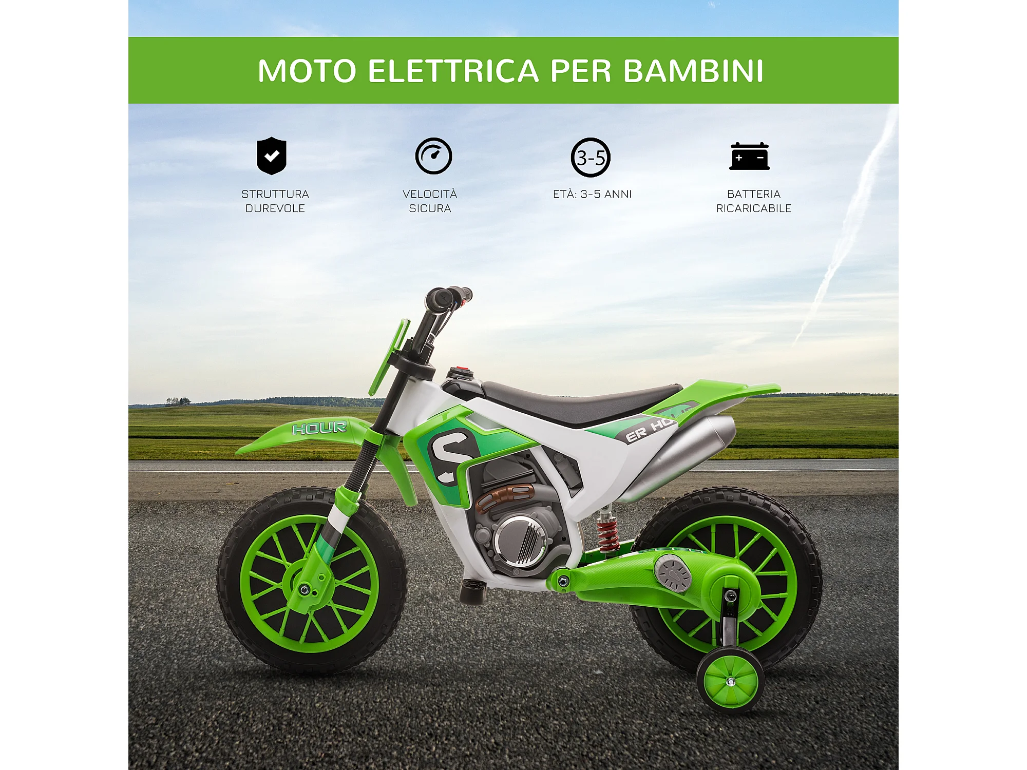 Moto da cross elettrica per bambini 12v ricaricabile con rotelle verde