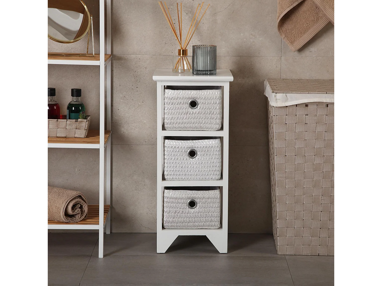Scaffale 3 ripiani mobiletto bagno multiuso mdf e bambù bianco