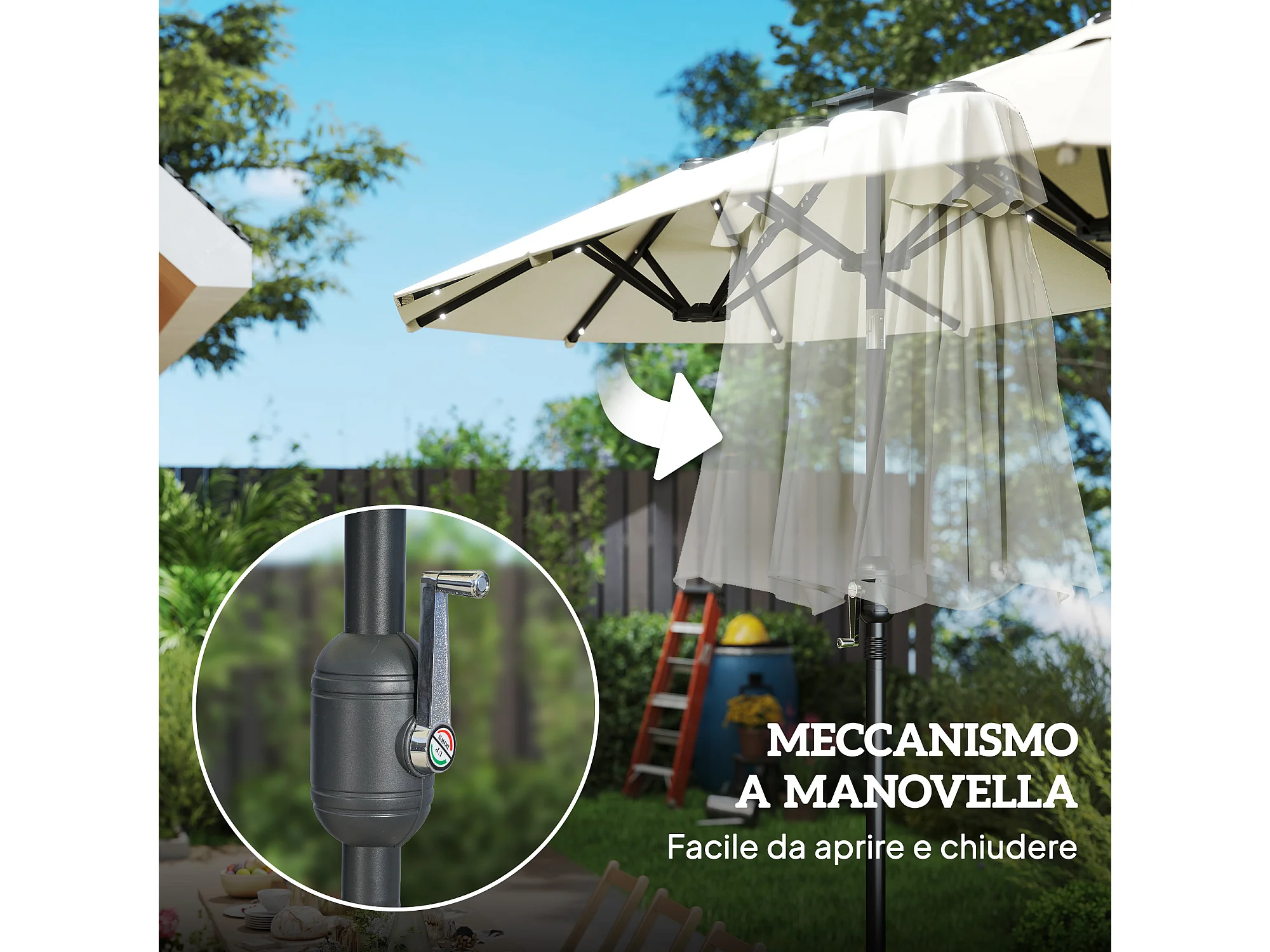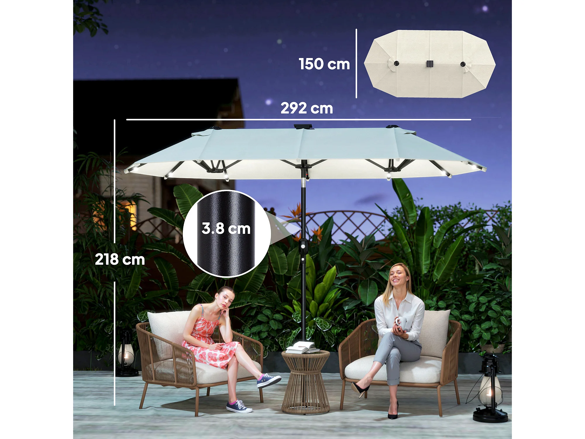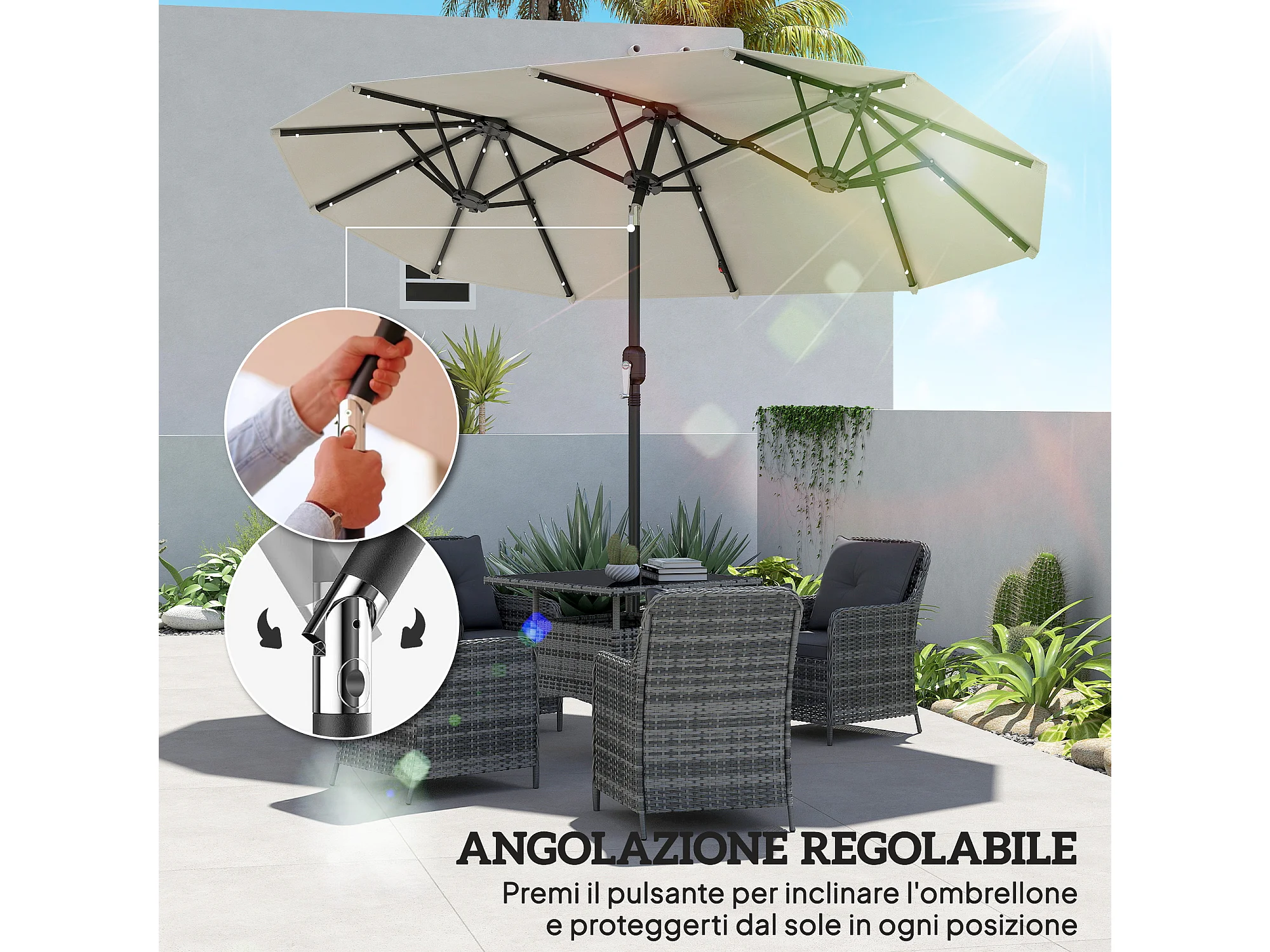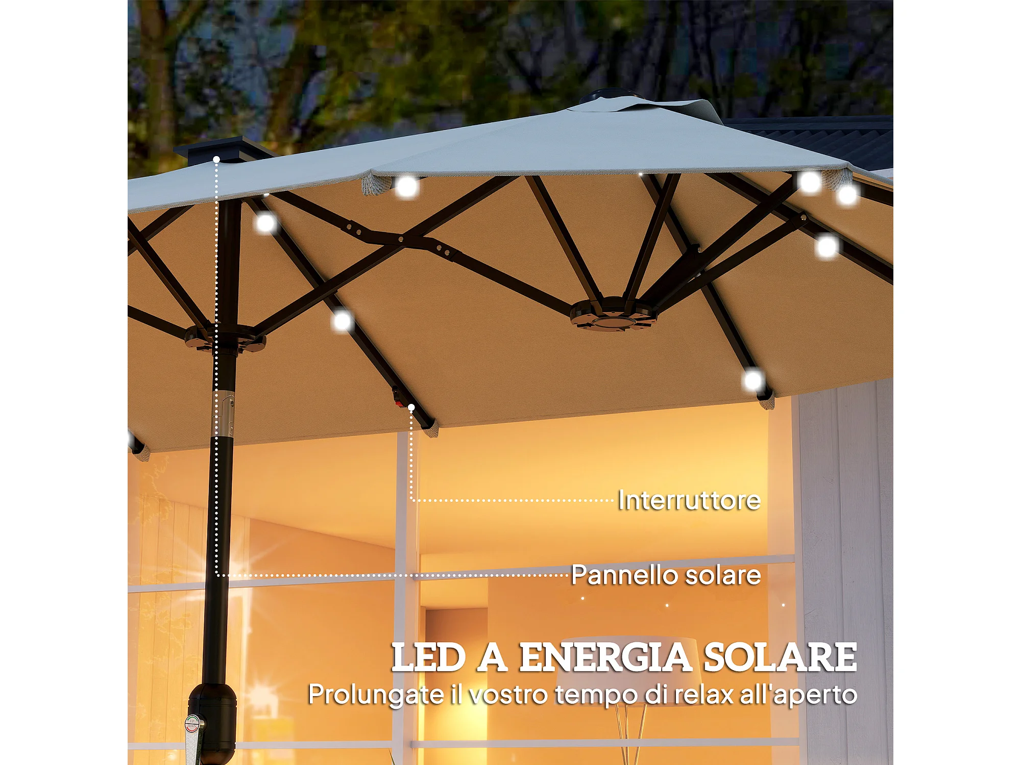 Ombrellone doppio 2.92x1.5x2.2 m con luci led e manovella beige