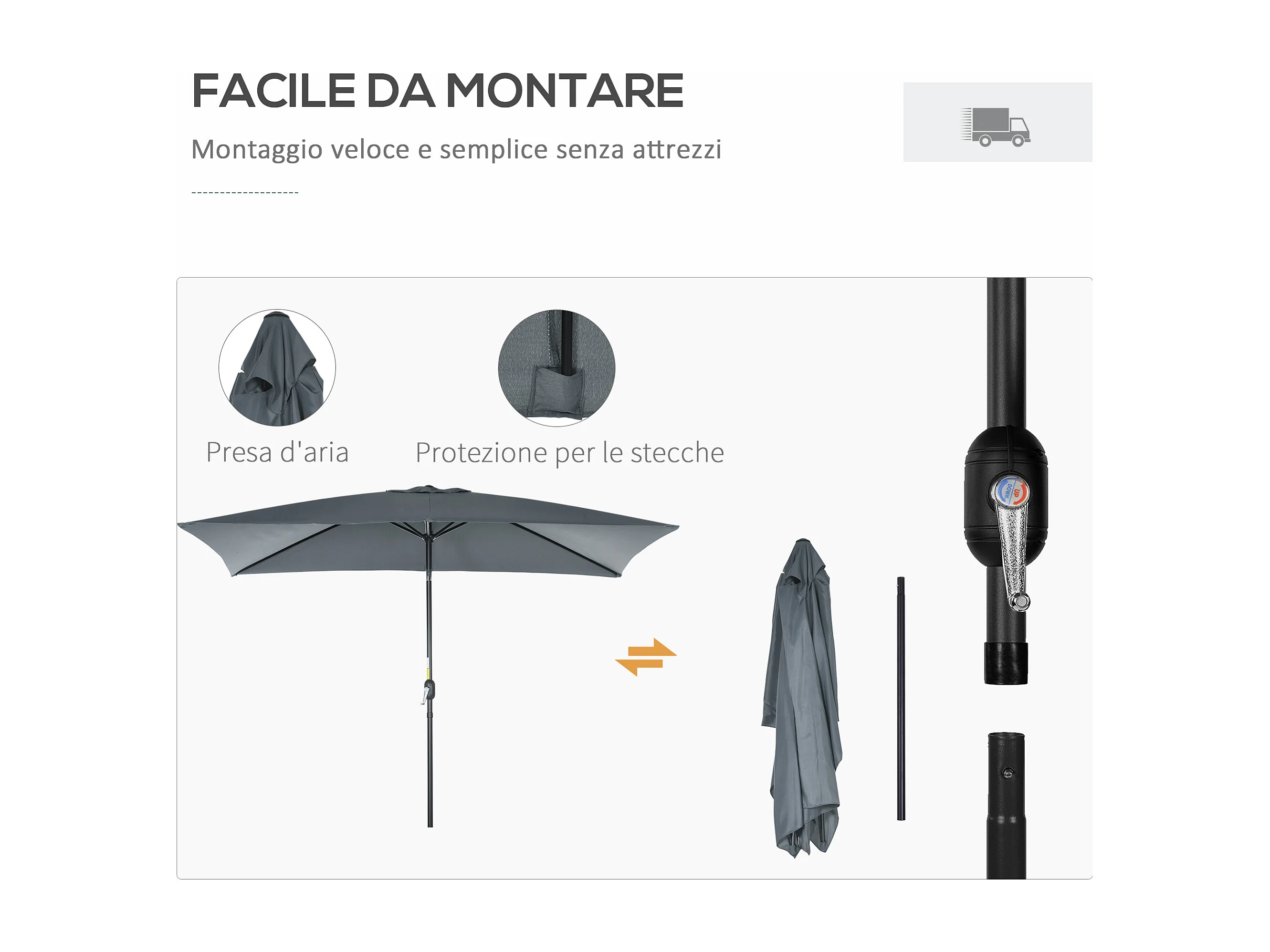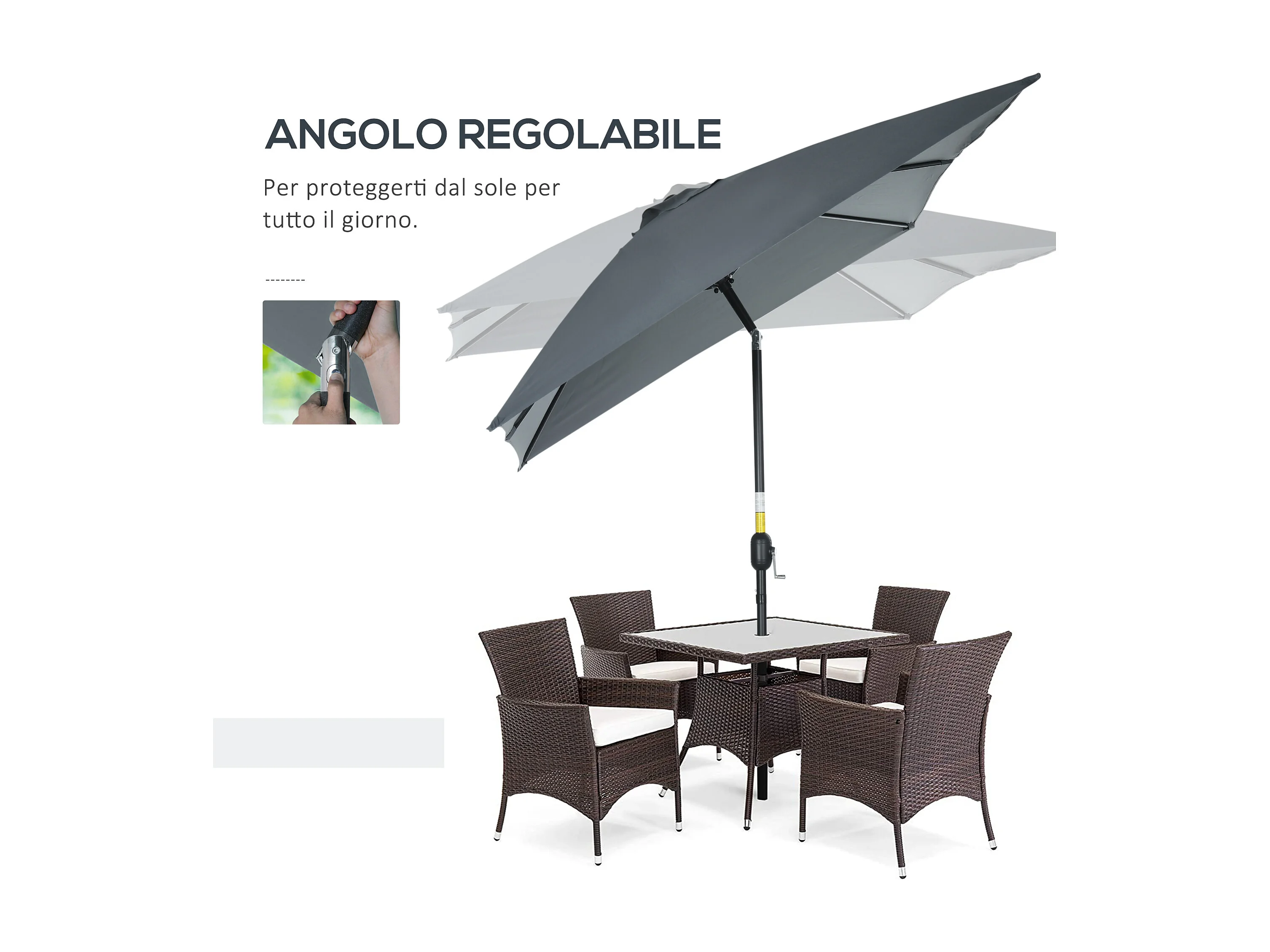 Ombrellone rettangolare 2x3 m pieghevole con manovella grigio scuro