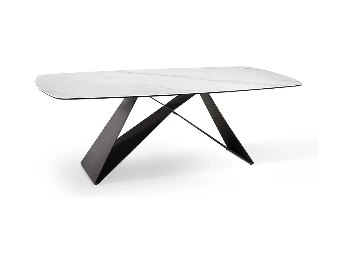 Halo, Tavolo fisso con top in ceramica su vetro con gambe in metallo verniciato/soft-touch. (110cm X 220cm H. 75cm)| Duzzle