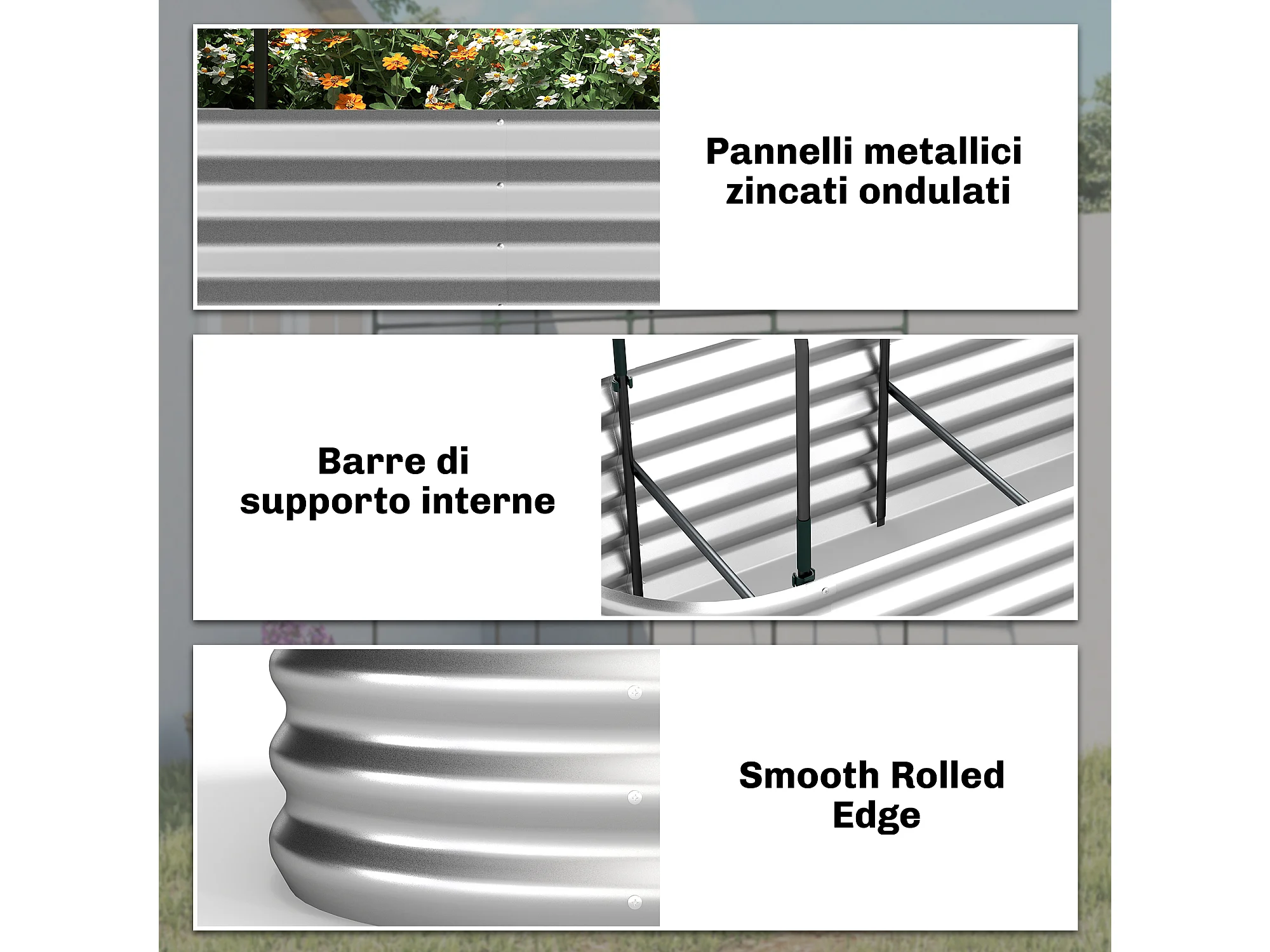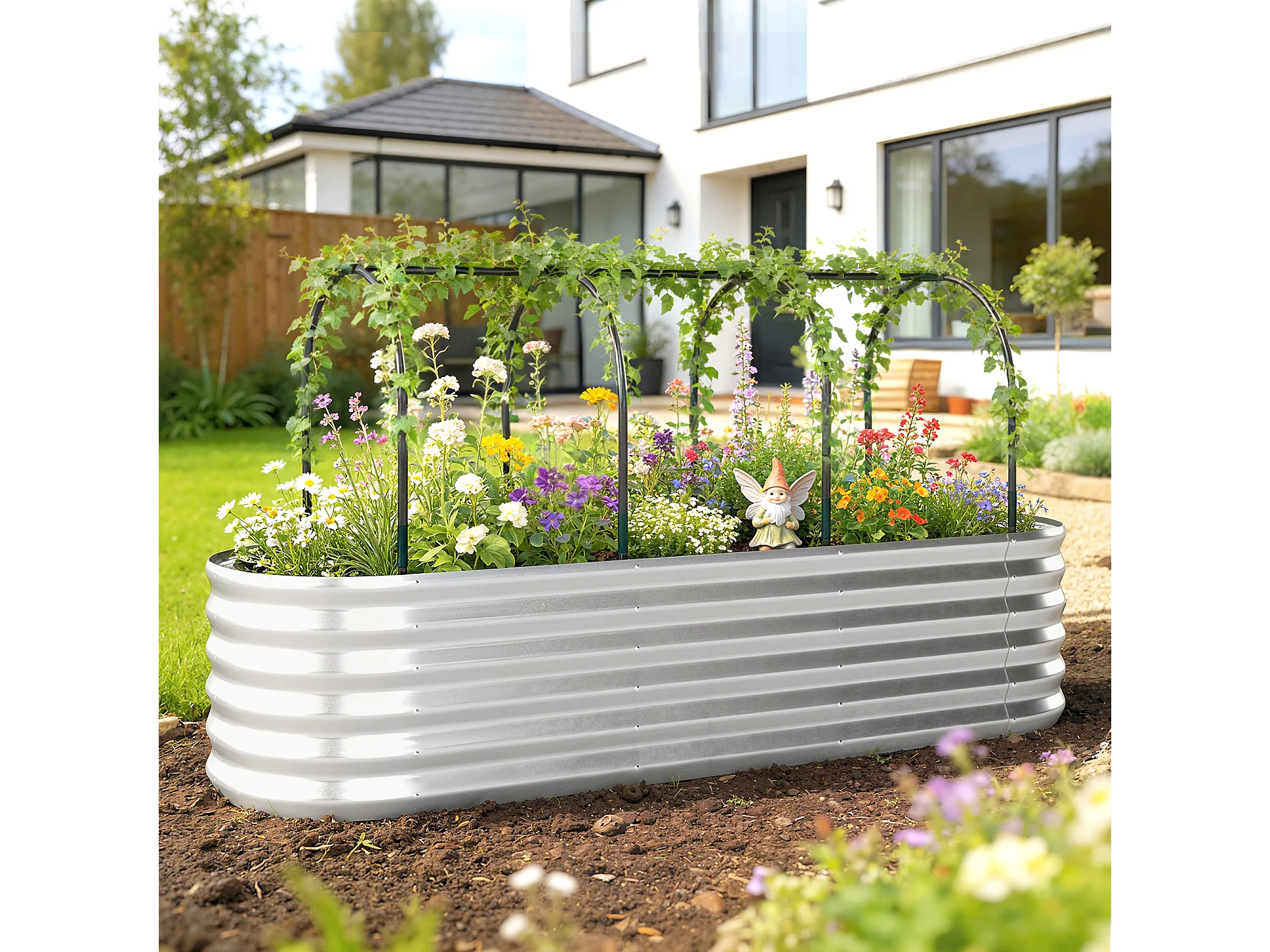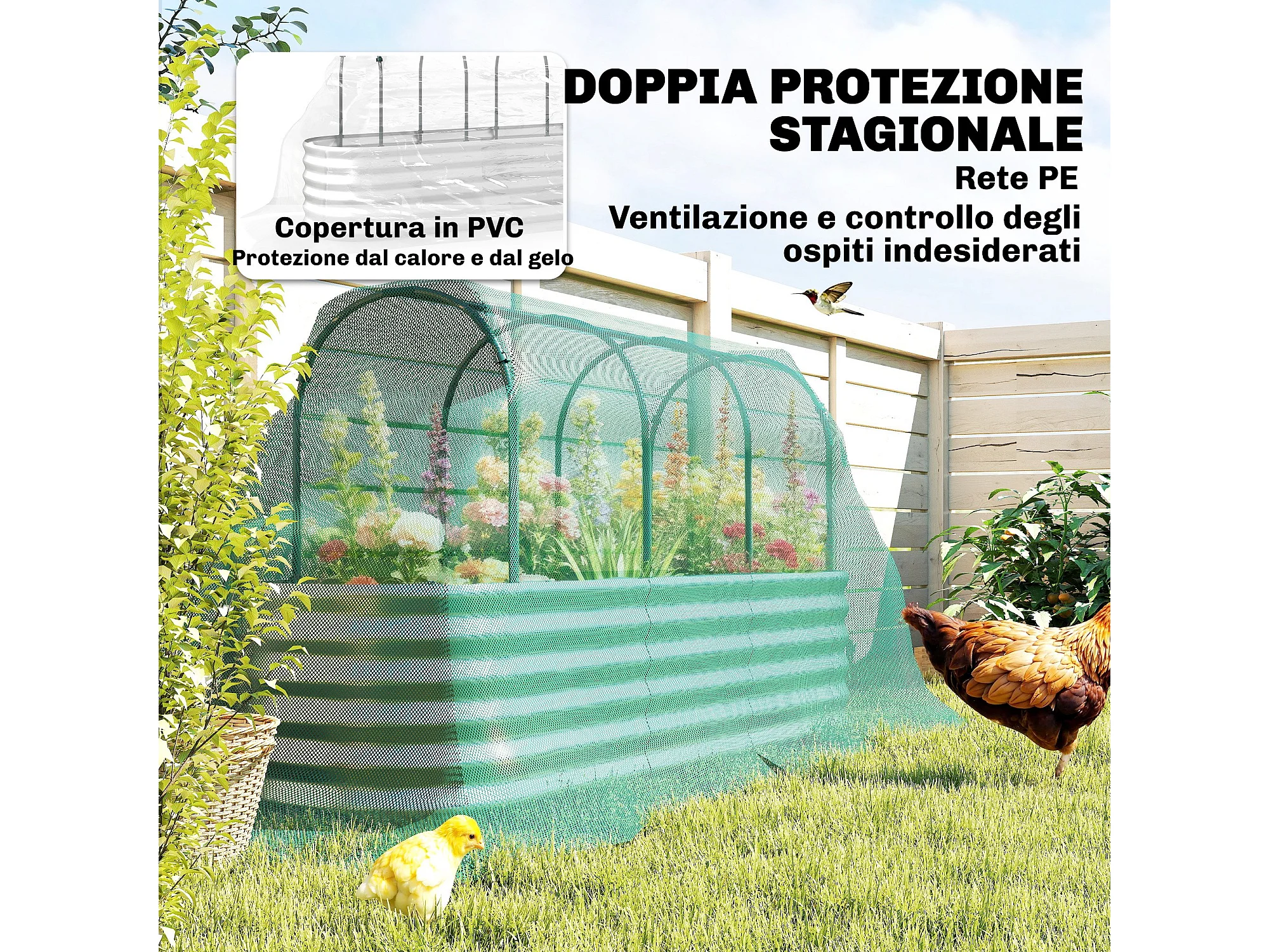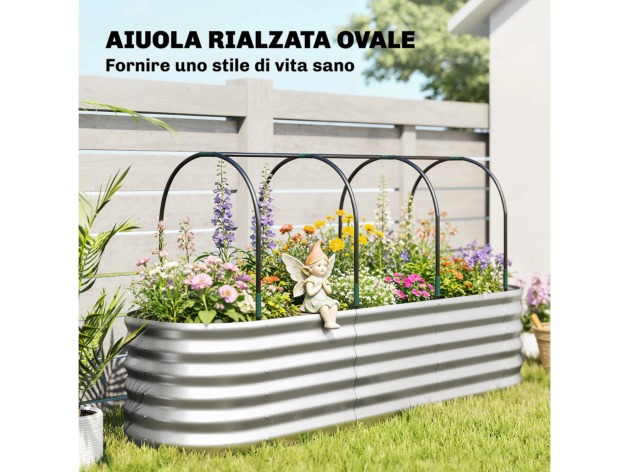 Orto rialzato con graticcio e serra in acciaio colore argento