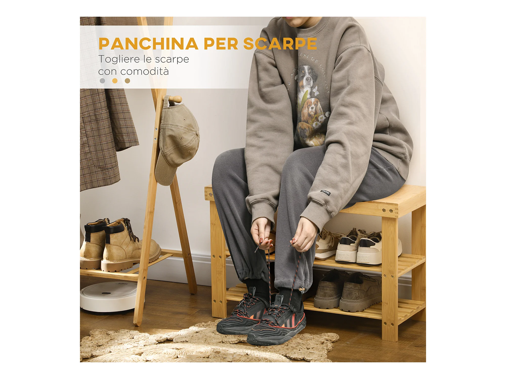 Panca scarpiera bassa con 2 ripiani a doghe in bambù
