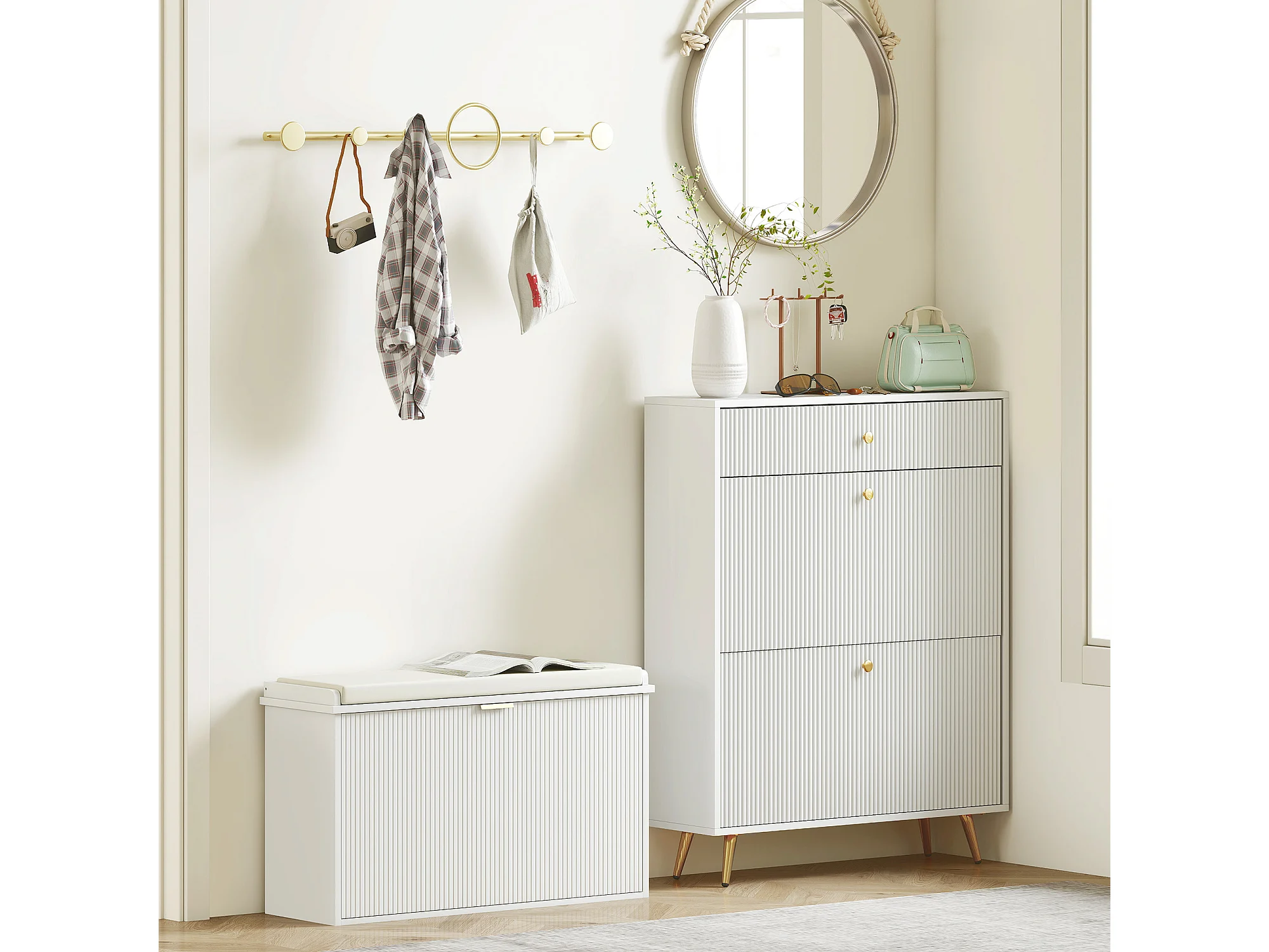 Scarpiera moderna da ingresso con panca imbottita in legno bianco