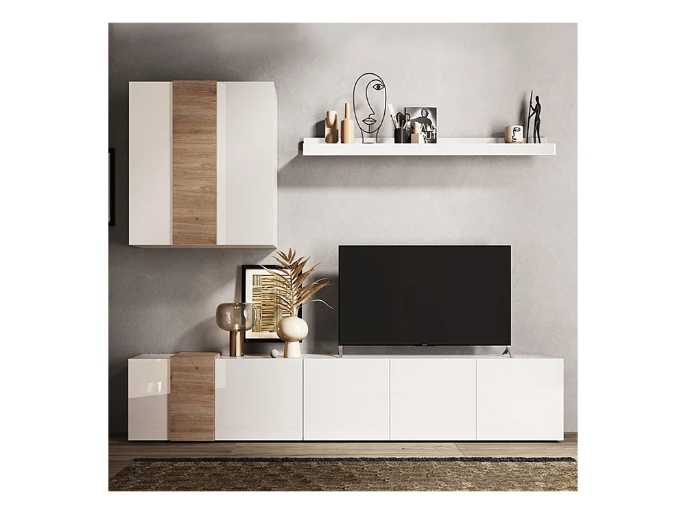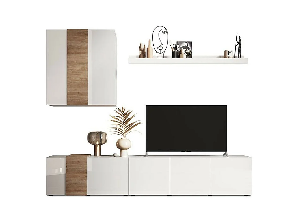 Parete attrezzata 301x44x195h Sabry colore bianco lucido rovere Kadiz