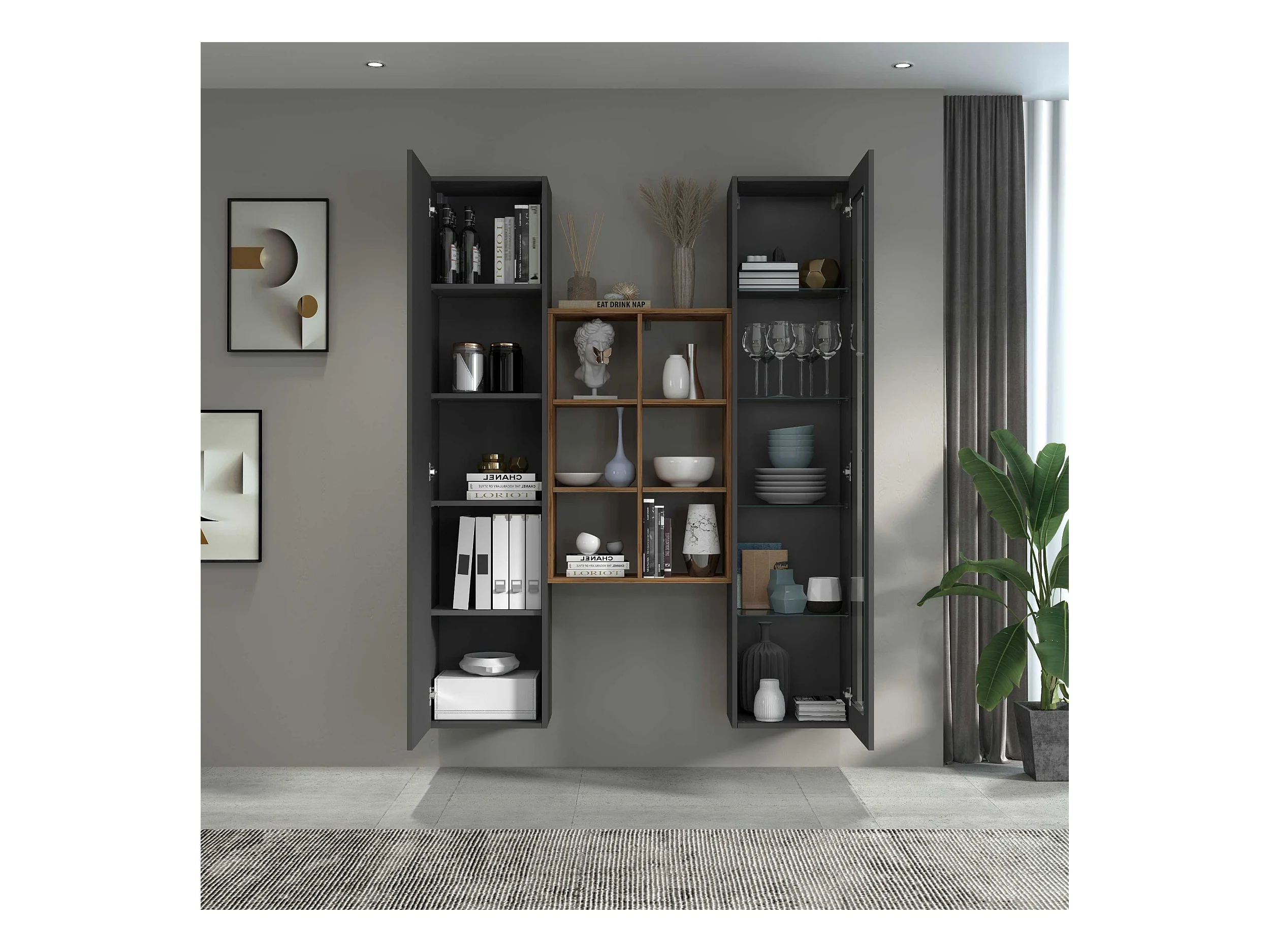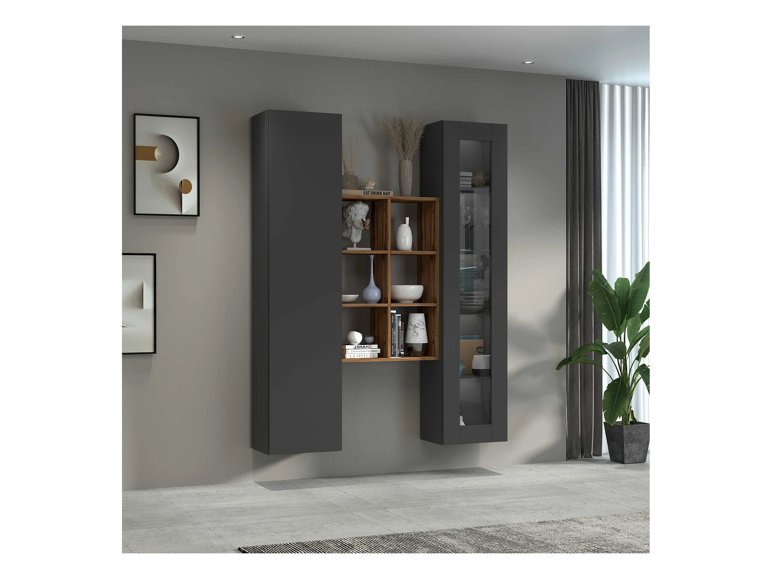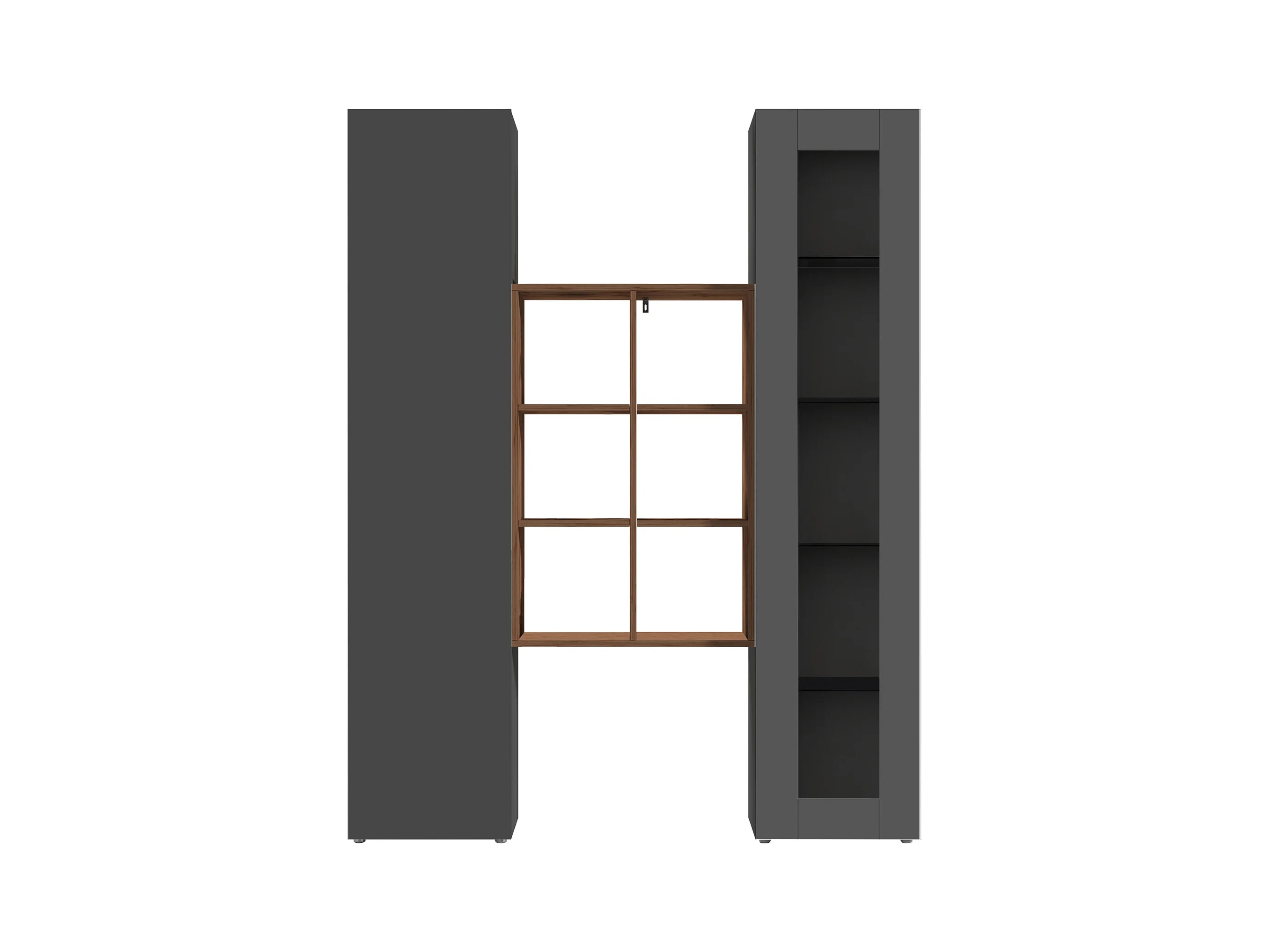 Set soggiorno Maruska con libreria e 2 colonne antracite opaco e rovere 170x30x180 cm