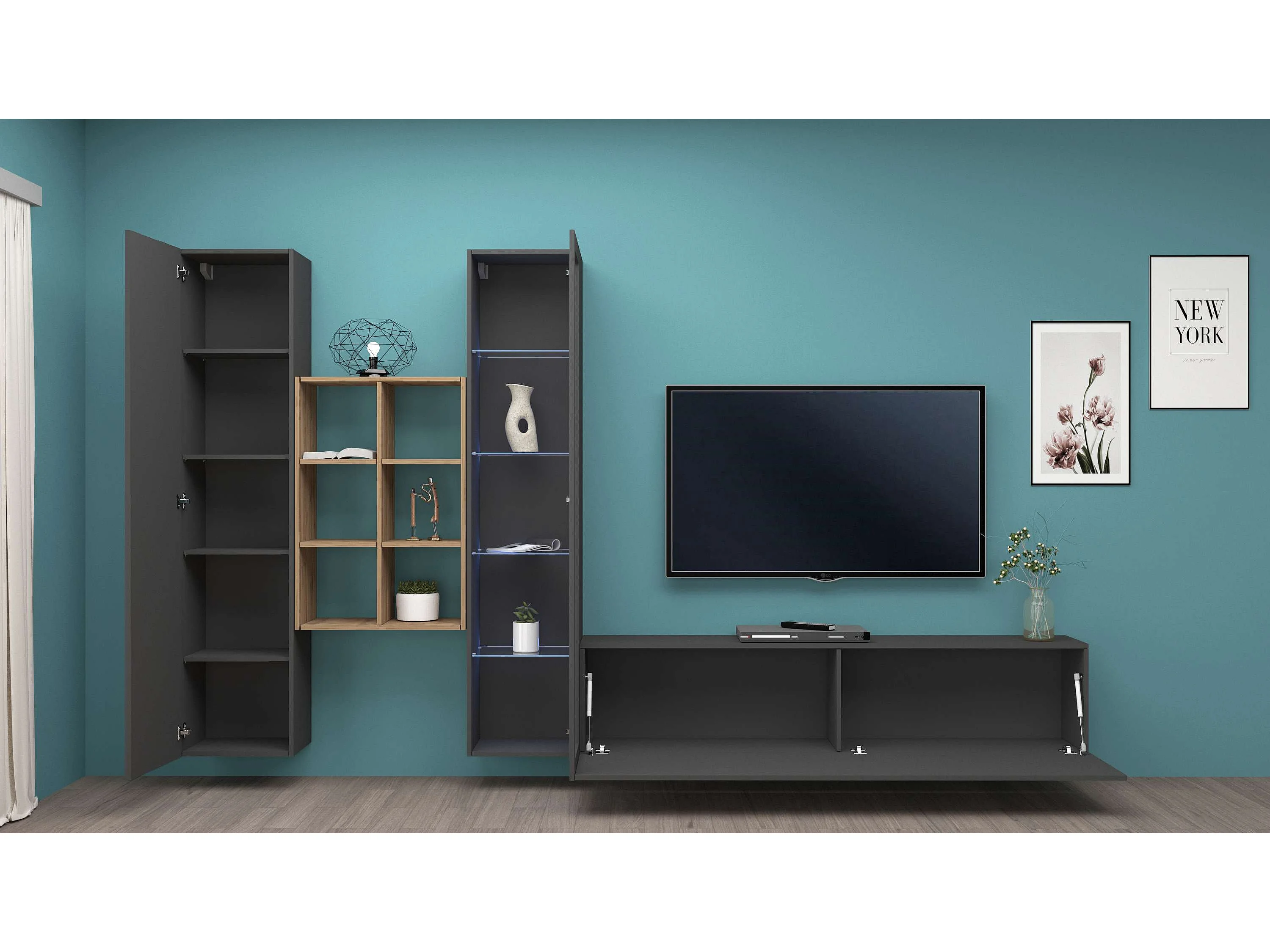 Parete attrezzata antracite moderna libreria mobile TV sospeso vetrina Loane RT
