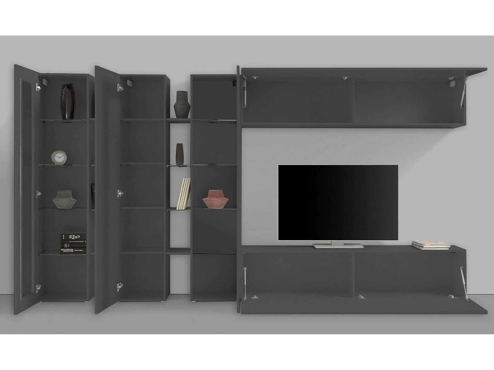 Parete attrezzata Clemente, Set salotto porta TV a 5 ante, Mobile soggiorno multiuso, 100% Made in Italy, cm 340x30h180, Antracite