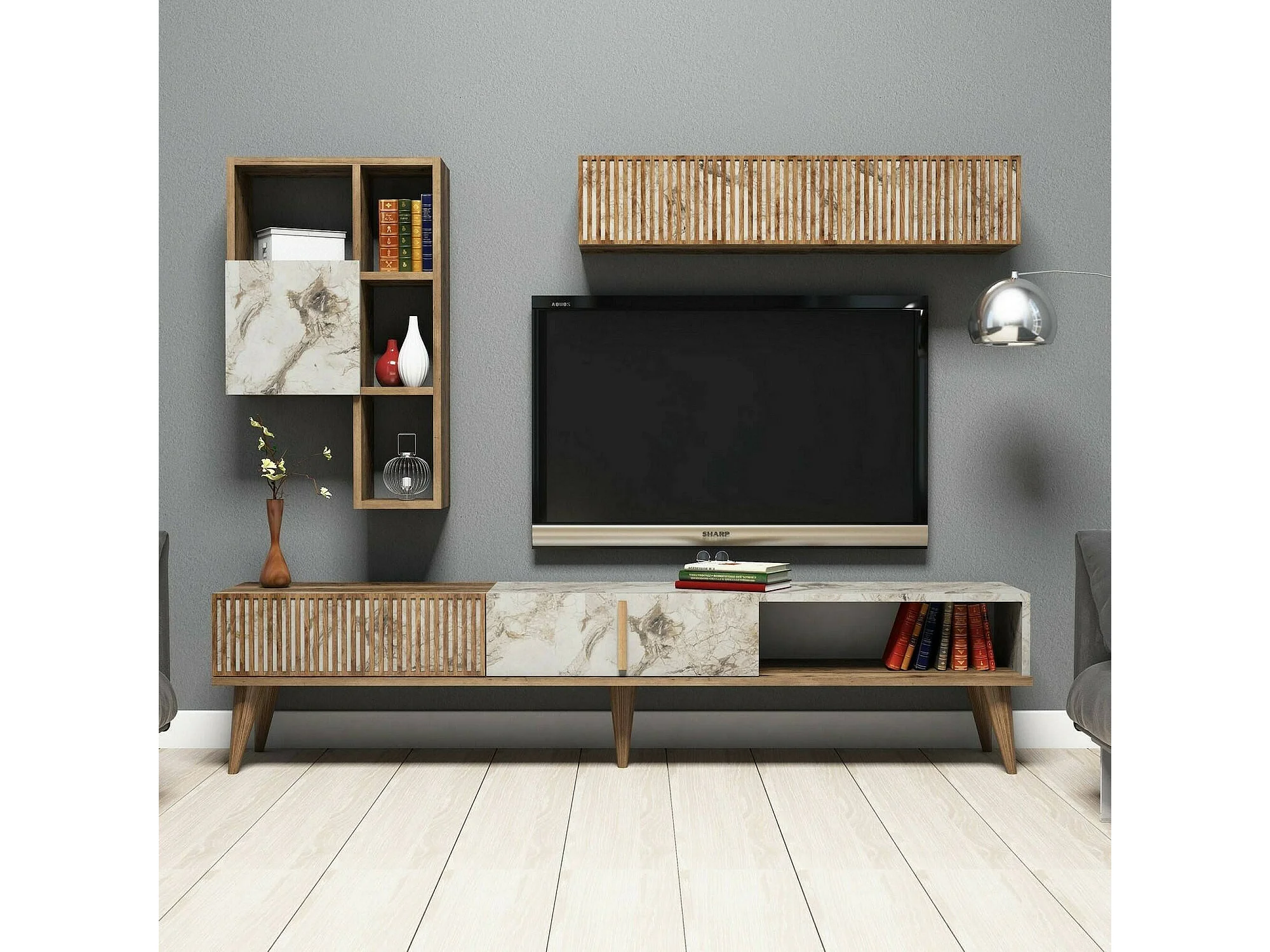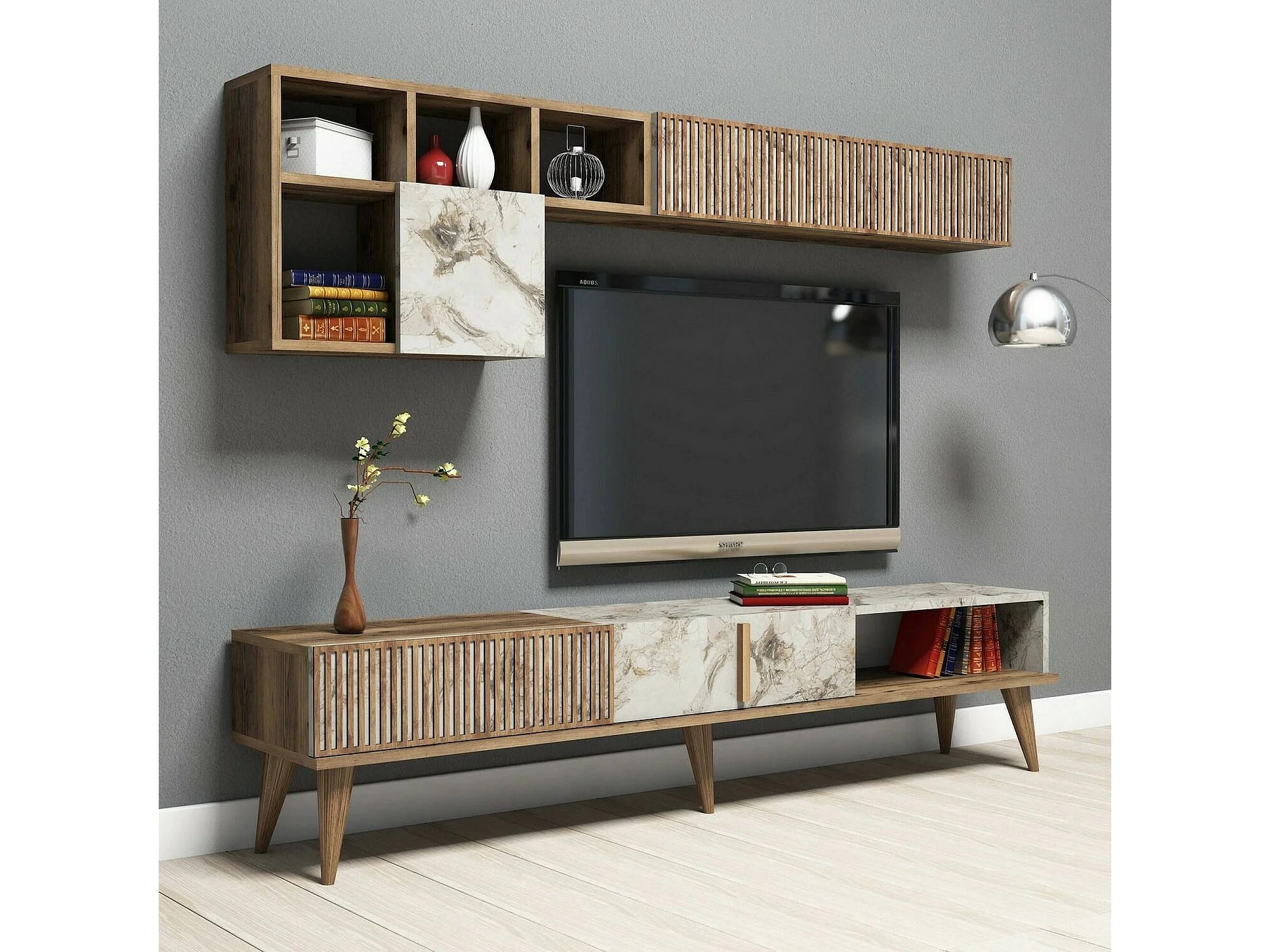 Dmora - Parete attrezzata Ostro, 180x35h40 cm, Noce e Bianco Marmo