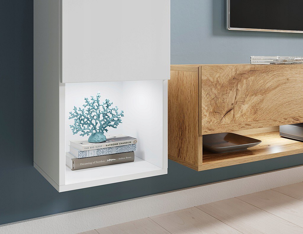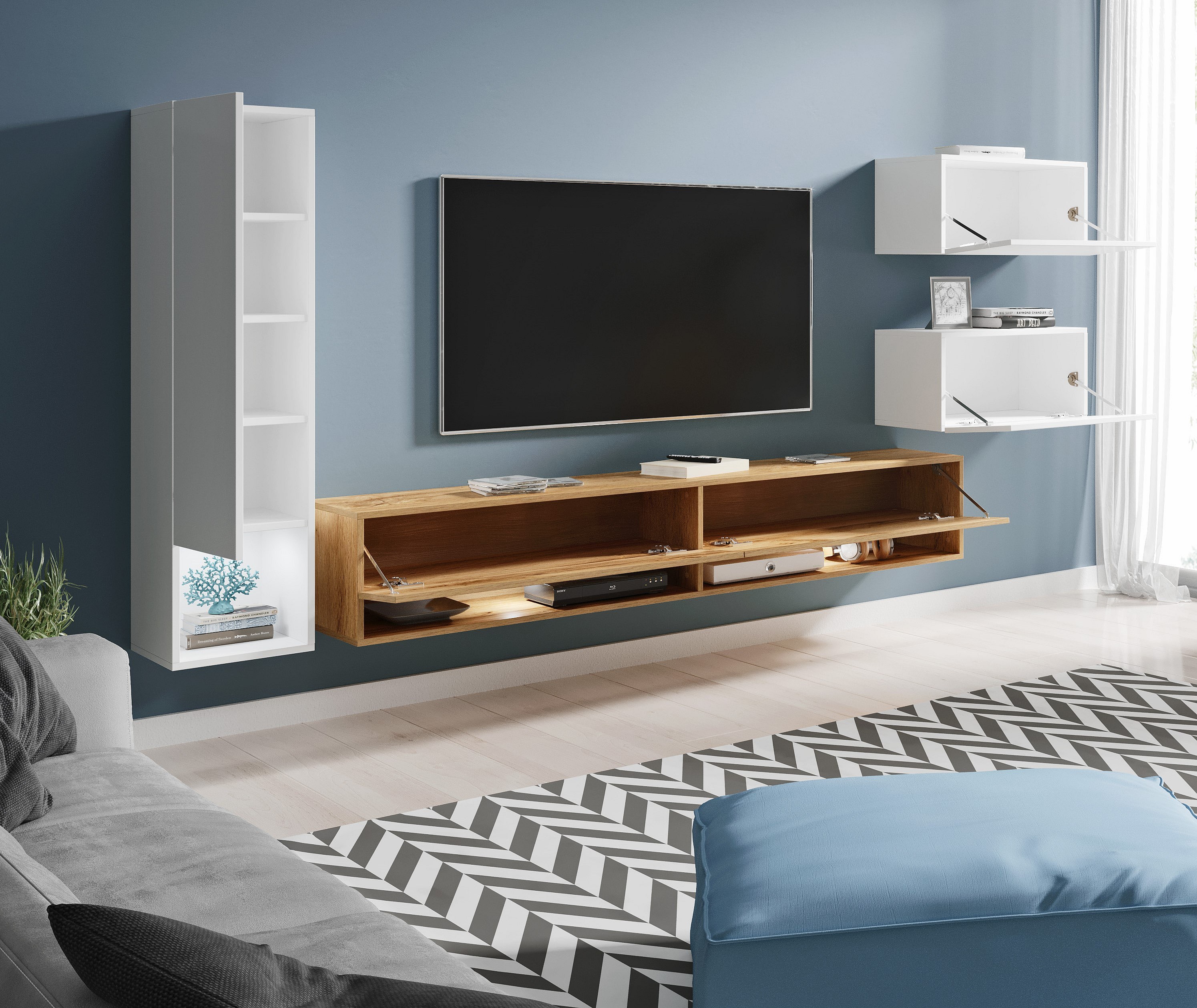 Parete attrezzata LED 4 pezzi – set sospeso TV 180 cm, colonna, 2 mobili, bianco lucido e rovere Wotan