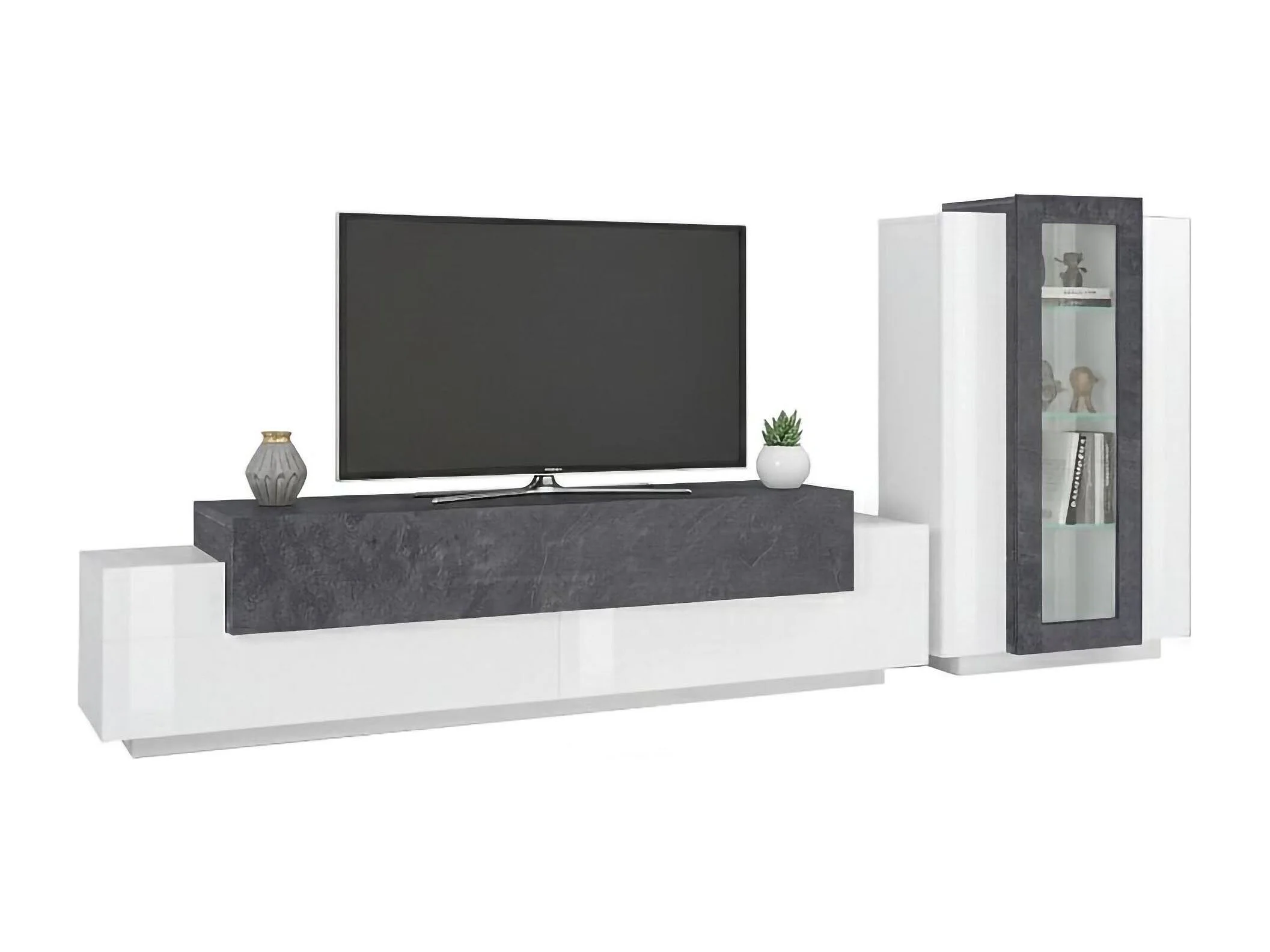 Parete attrezzata Mirko, Set salotto porta TV, Mobile soggiorno multiuso, 100% Made in Italy, cm 280x45h121, Bianco lucido e Ardesia