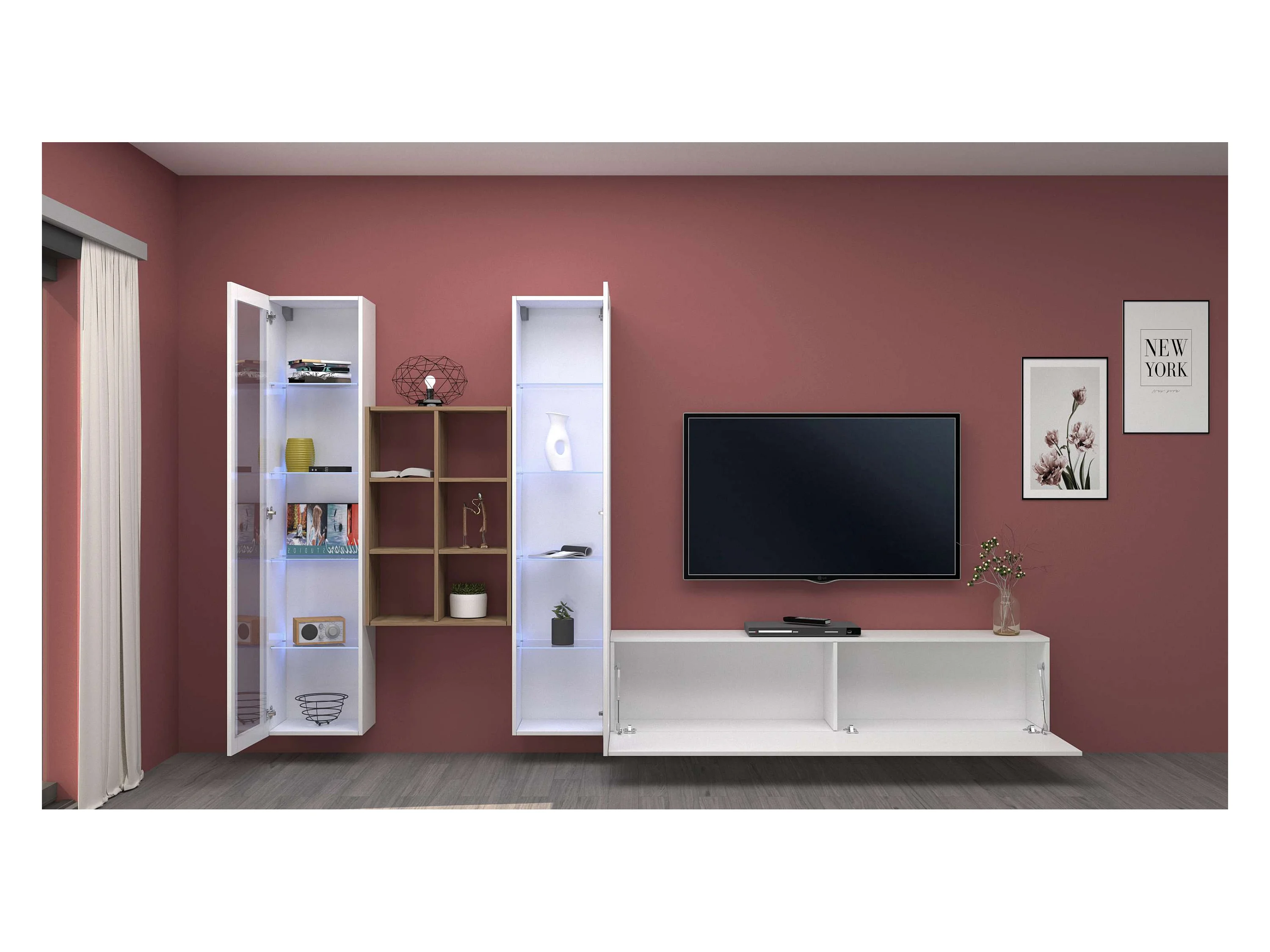Parete attrezzata mobile TV bianco sospeso 2 vetrine libreria Yves WH