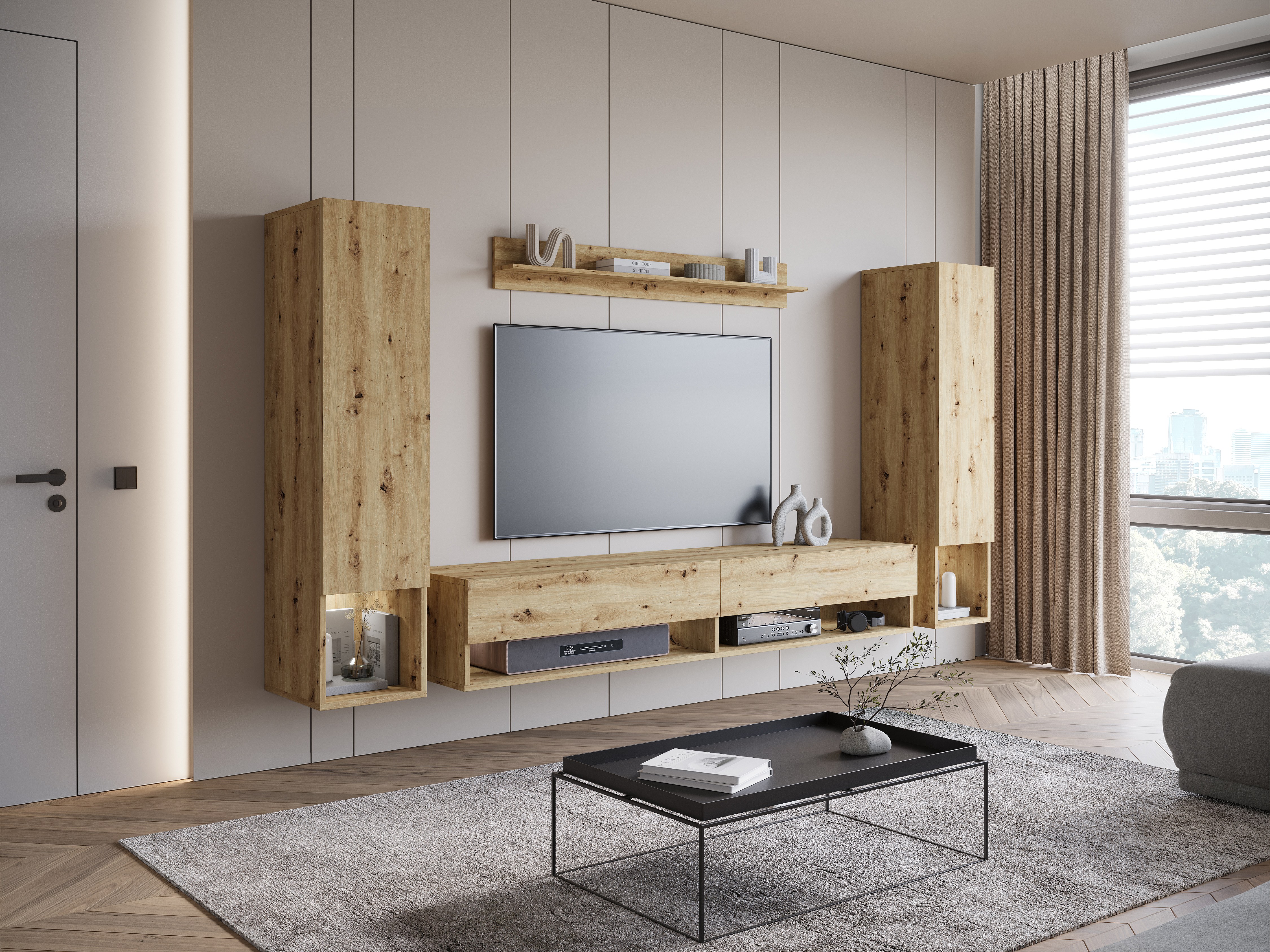 Parete attrezzata moderna con LED – set sospeso per soggiorno 2 colonne + mobile TV 180 cm + mensola, rovere artisan