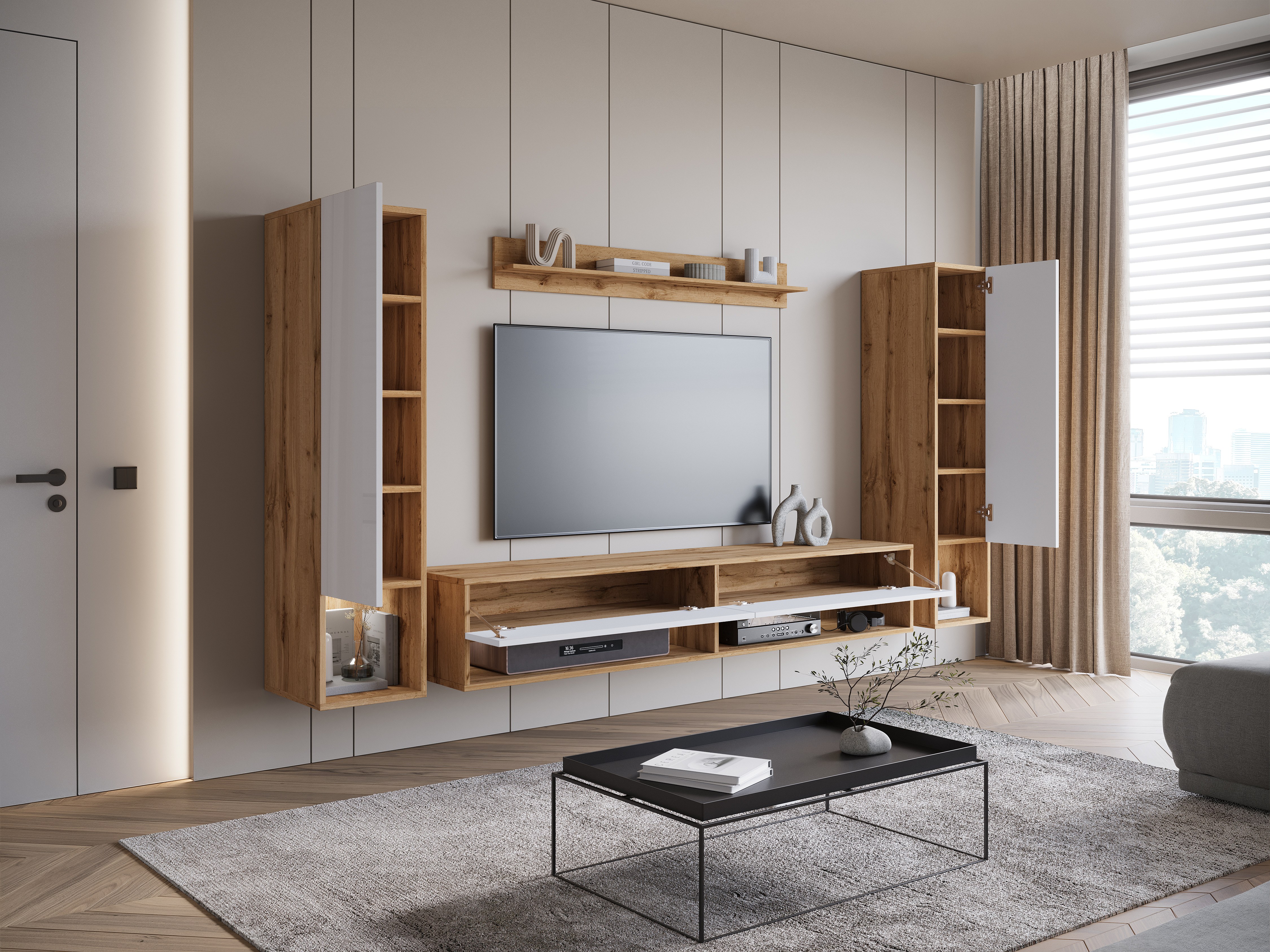Parete attrezzata moderna con LED – set sospeso per soggiorno 2 colonne + mobile TV 180 cm + mensola, struttura rovere wotan, frontali bianco lucido