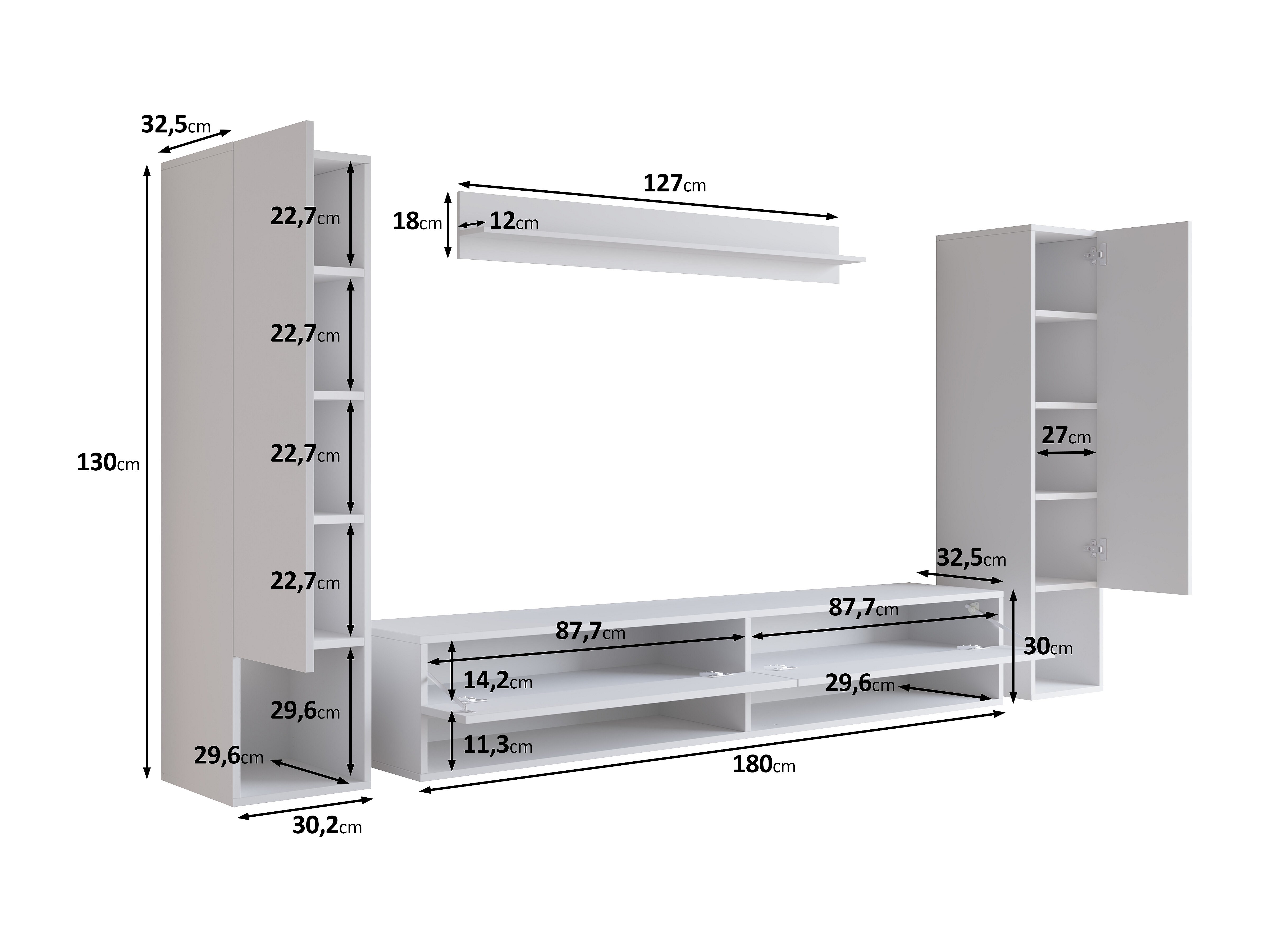 Parete attrezzata moderna con LED – set sospeso per soggiorno 2 colonne + mobile TV 180 cm + mensola, struttura rovere wotan, frontali nero lucido