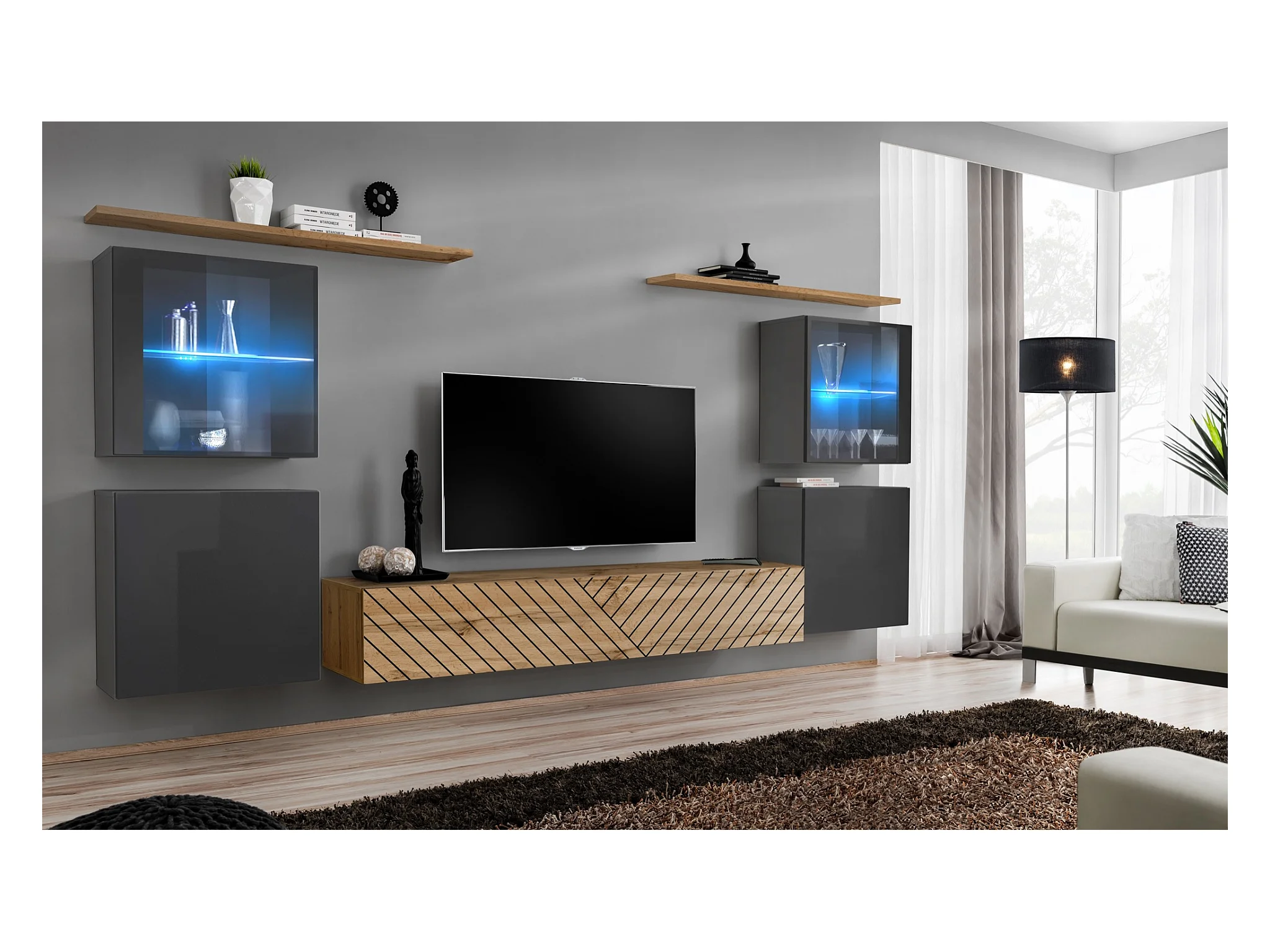 Parete attrezzata design moderno con vetrina 340x150 grigio e rovere PAP61