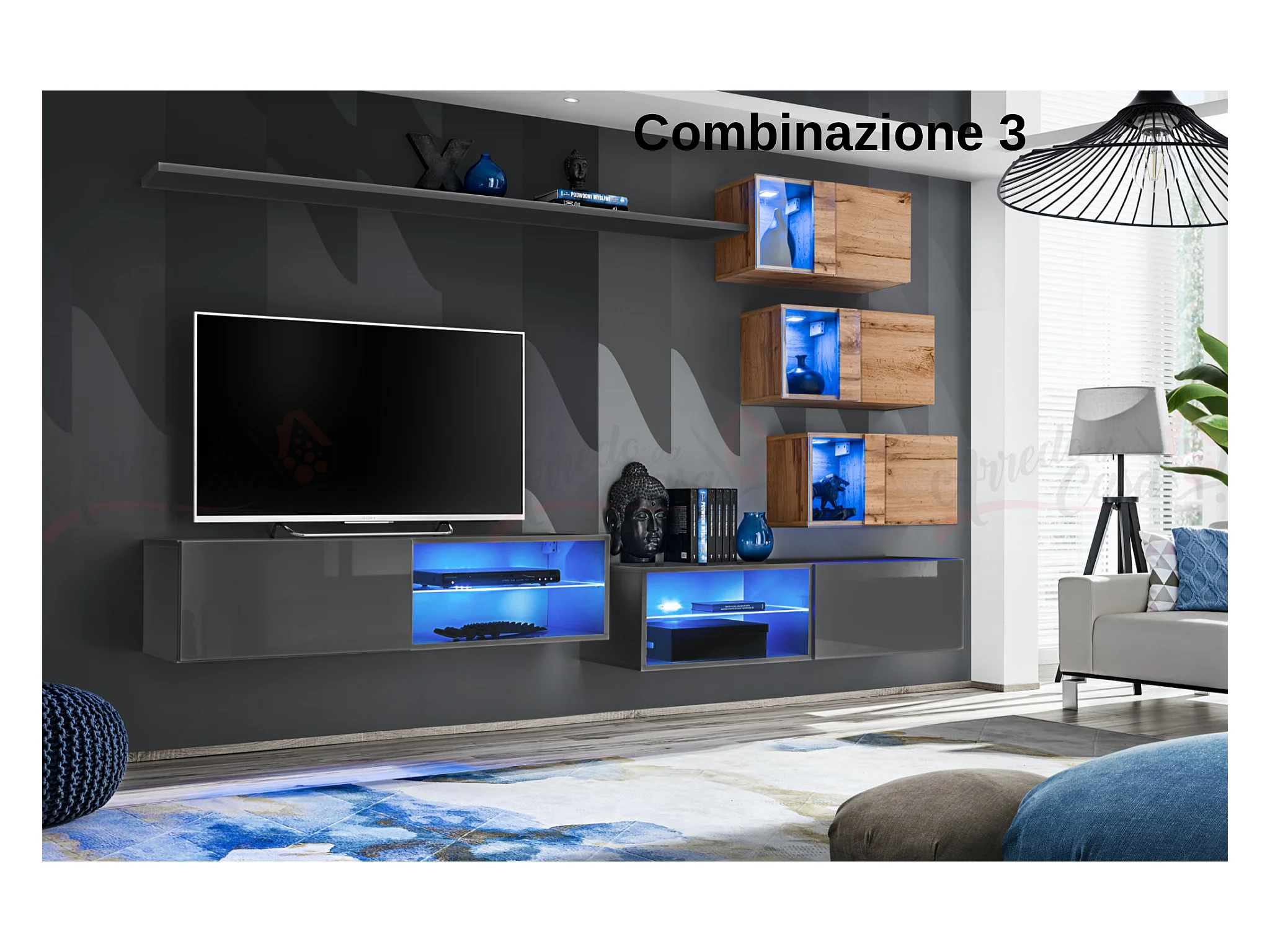 Parete attrezzata per soggiorno con vetrinette e luci led 260x170 grigio e rovere PAP70