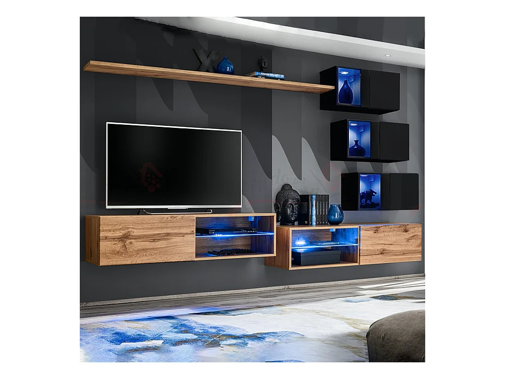 Parete attrezzata per soggiorno con vetrinette e luci led 260x170 rovere e nero PAP70