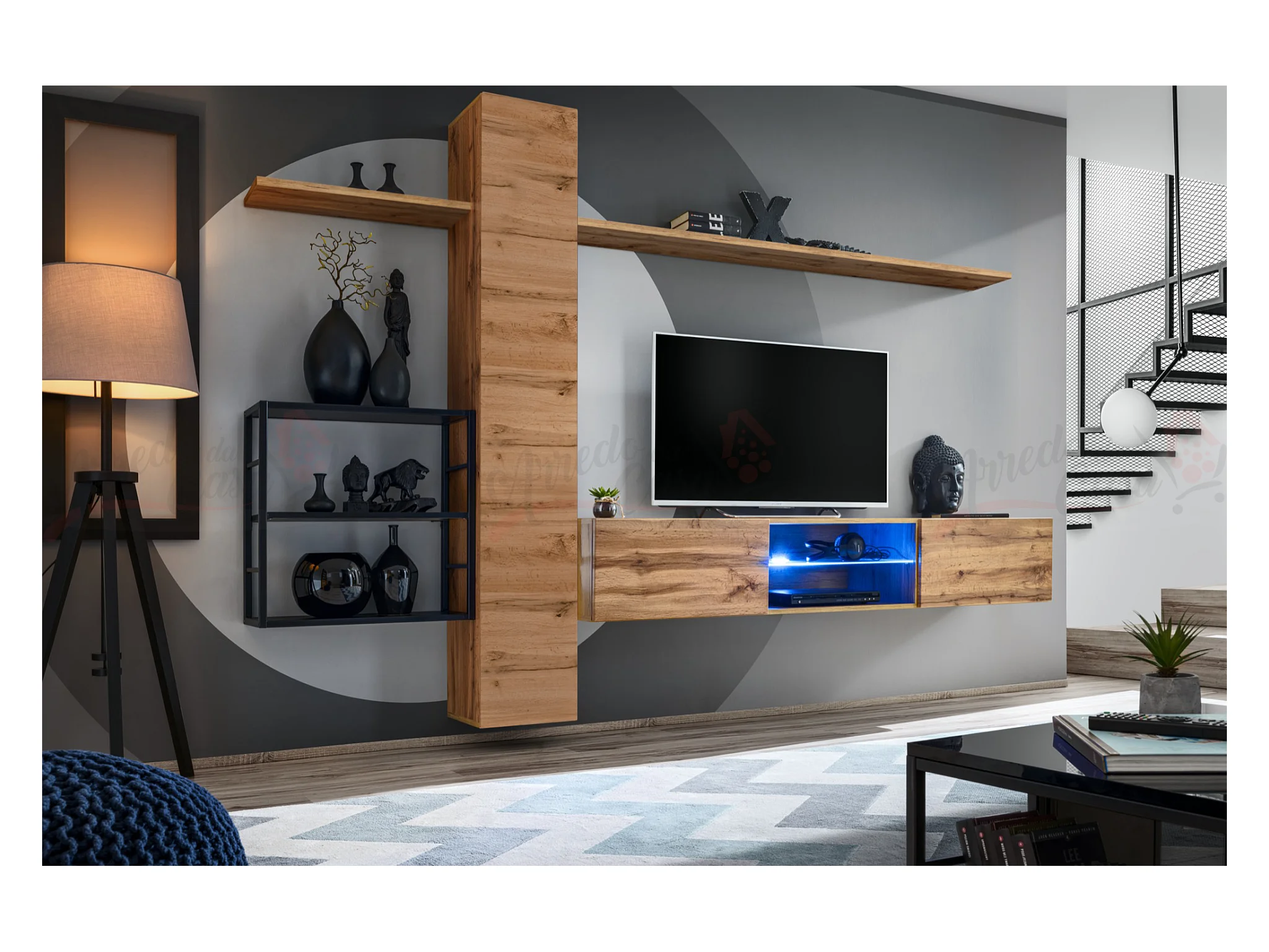 Parete attrezzata moderna per soggiorno con luci led 280x180 rovere PAP62