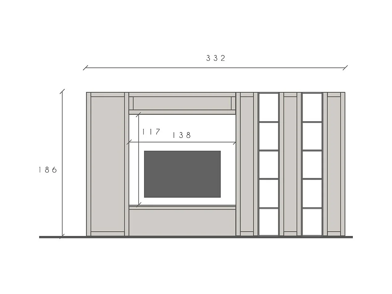 Parete attrezzata soggiorno con libreria 332x186 cm beige e noce PAL74