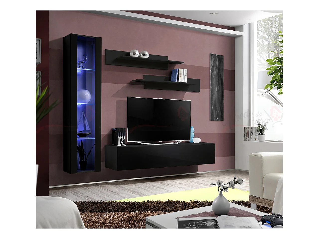 Parete attrezzata soggiorno con vetrina sospesa e led 210x190 nero PAP97