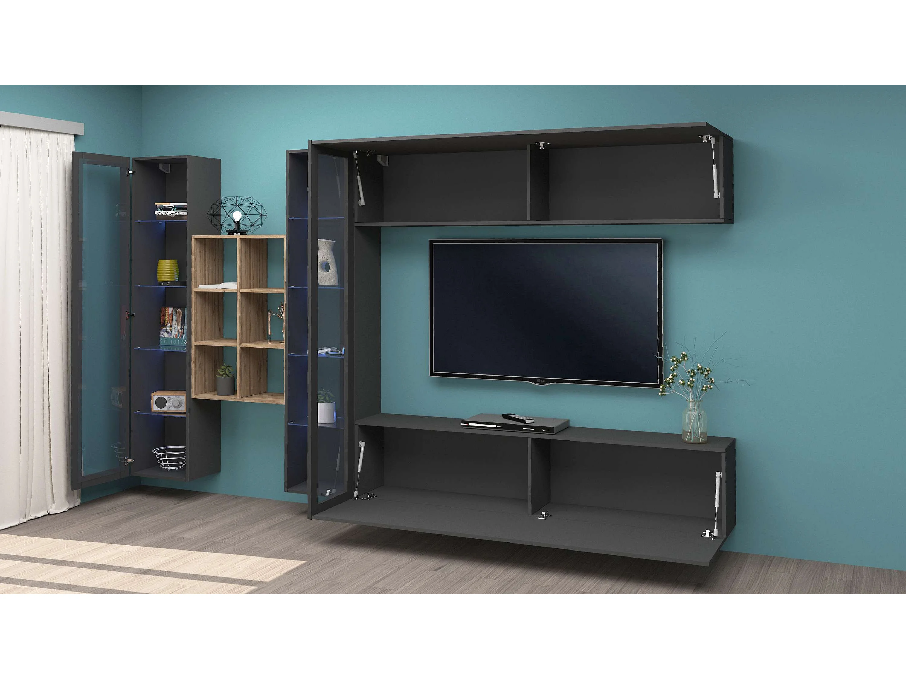 Parete attrezzata antracite moderna libreria mobile TV sospeso vetrina Loane RT