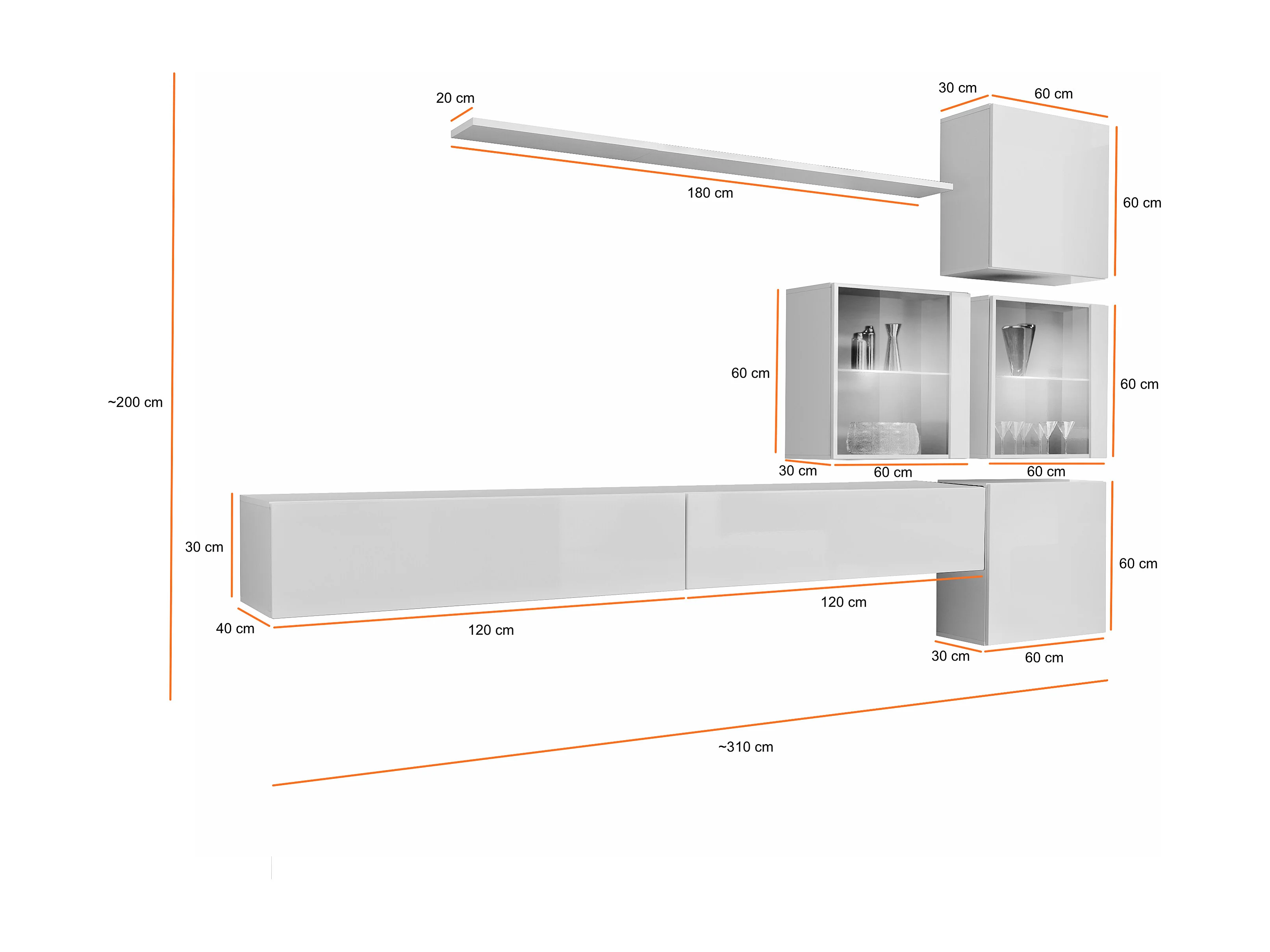Parete attrezzata sospesa moderna con vetrinette 310x200 rovere e nero PAP63