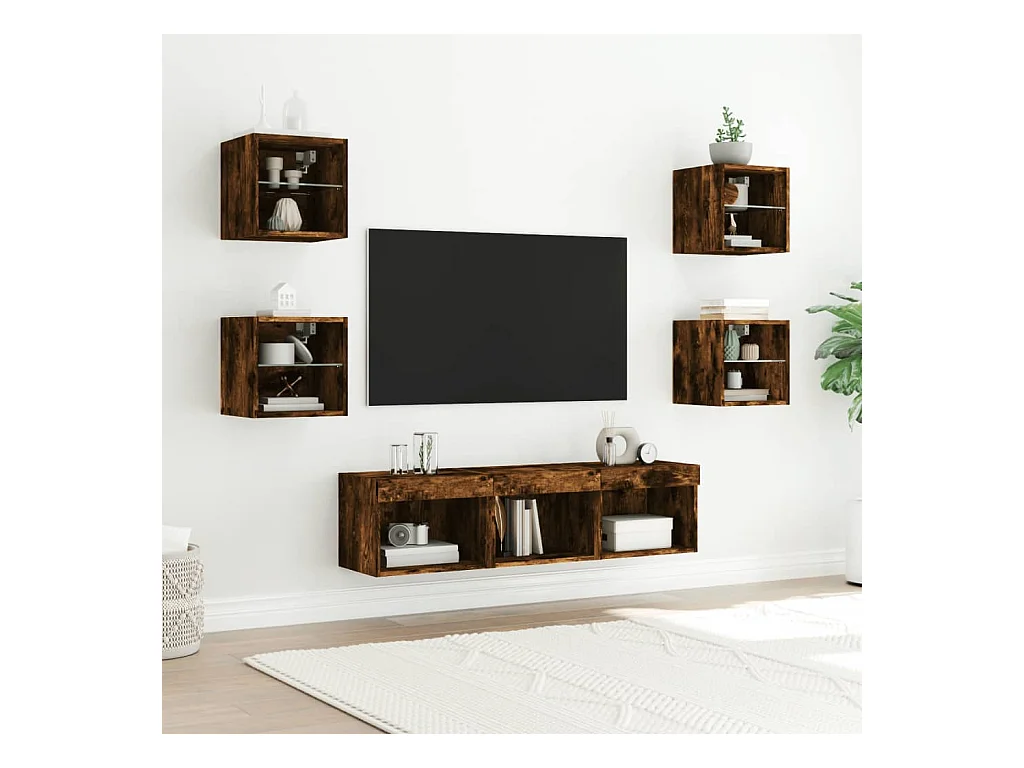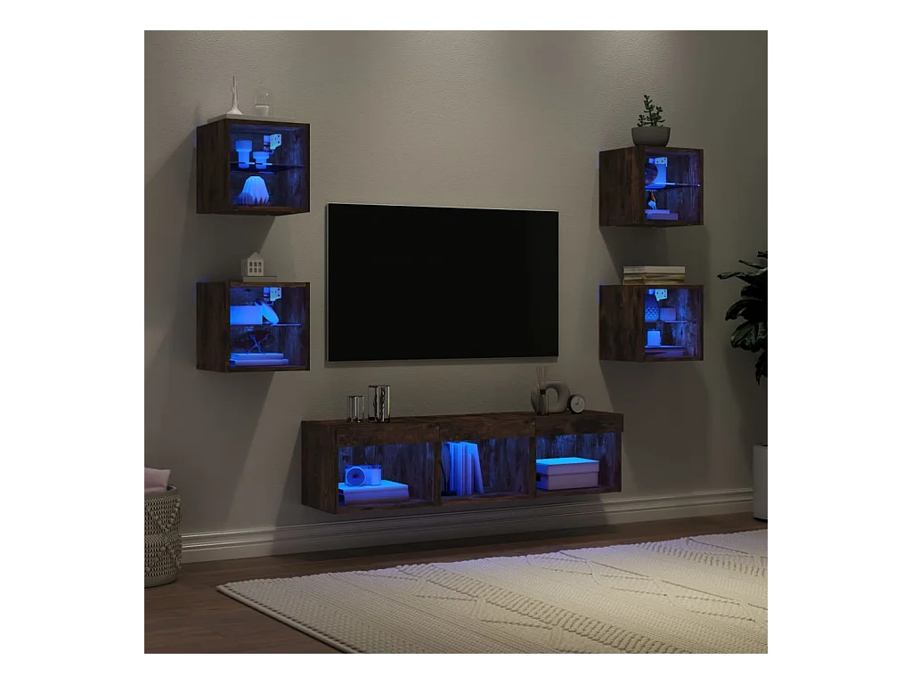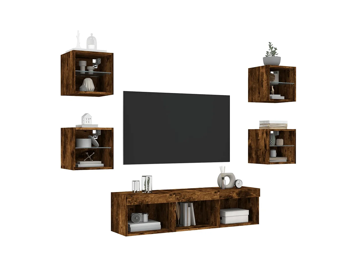 Parete attrezzata TV con LED 7 pezzi in legno ingegnerizzato rovere affumicato