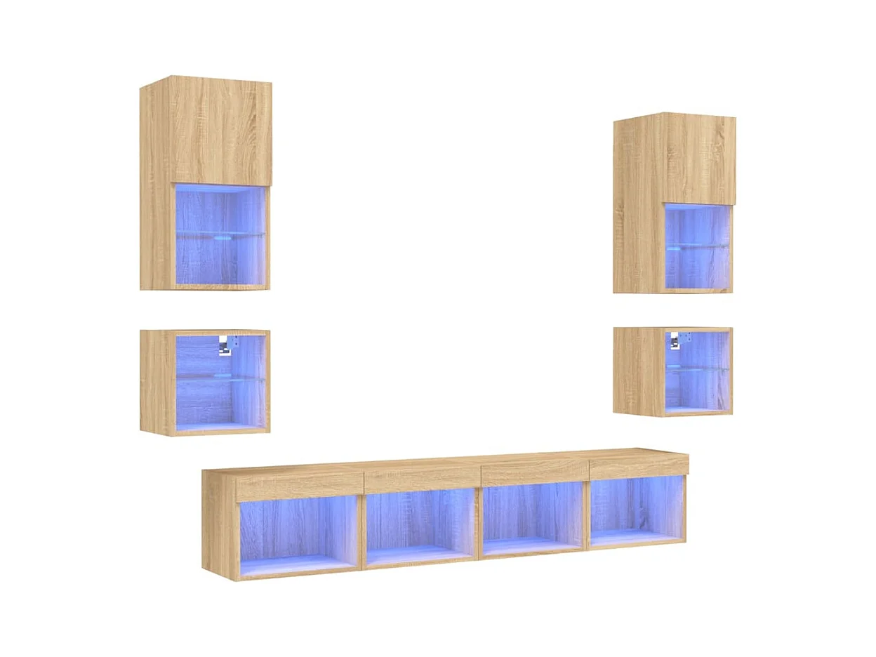 Parete attrezzata TV con LED 6 pezzi in legno ingegnerizzato rovere Sonoma